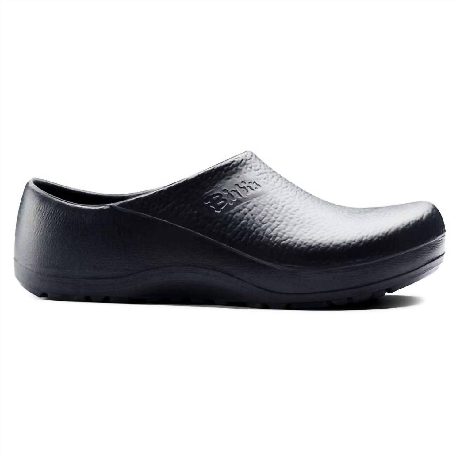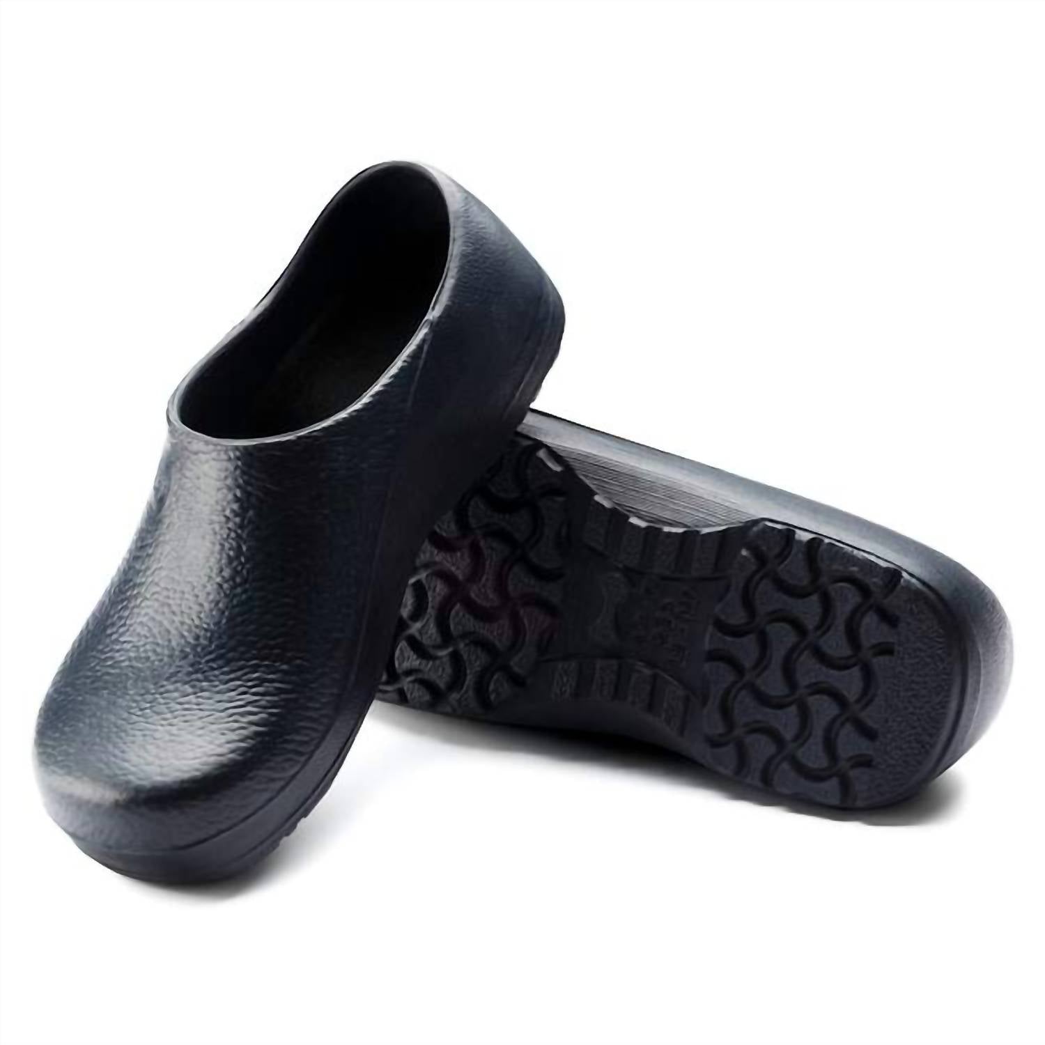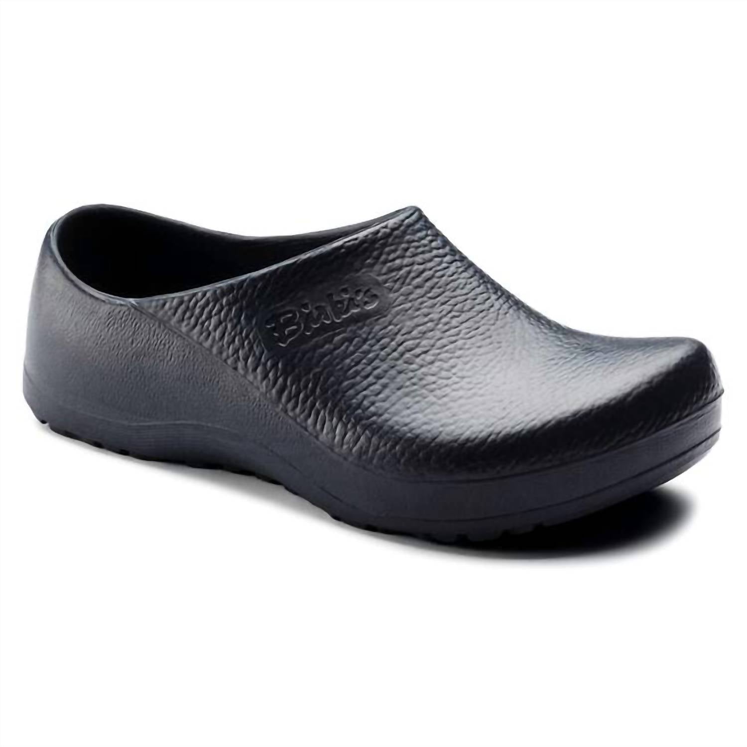 The Unisex Profi-birki Clog by Birkenstock in blue is a versatile choice for both occupational and private settings. Made from water-resistant and dirt-repellent polyurethane, this clog is designed to withstand oil and grease, making it perfect for kitchens, medical environments, and gardens. It features a removable, anatomically shaped cork-latex footbed lined with moisture-wicking fabric, which is washable at up to 30°C, while the clog itself can be cleaned at temperatures up to 60°C. Ideal for summer vacations, it combines minimalistic style with practical functionality, boasting a flat heel and round toe design.