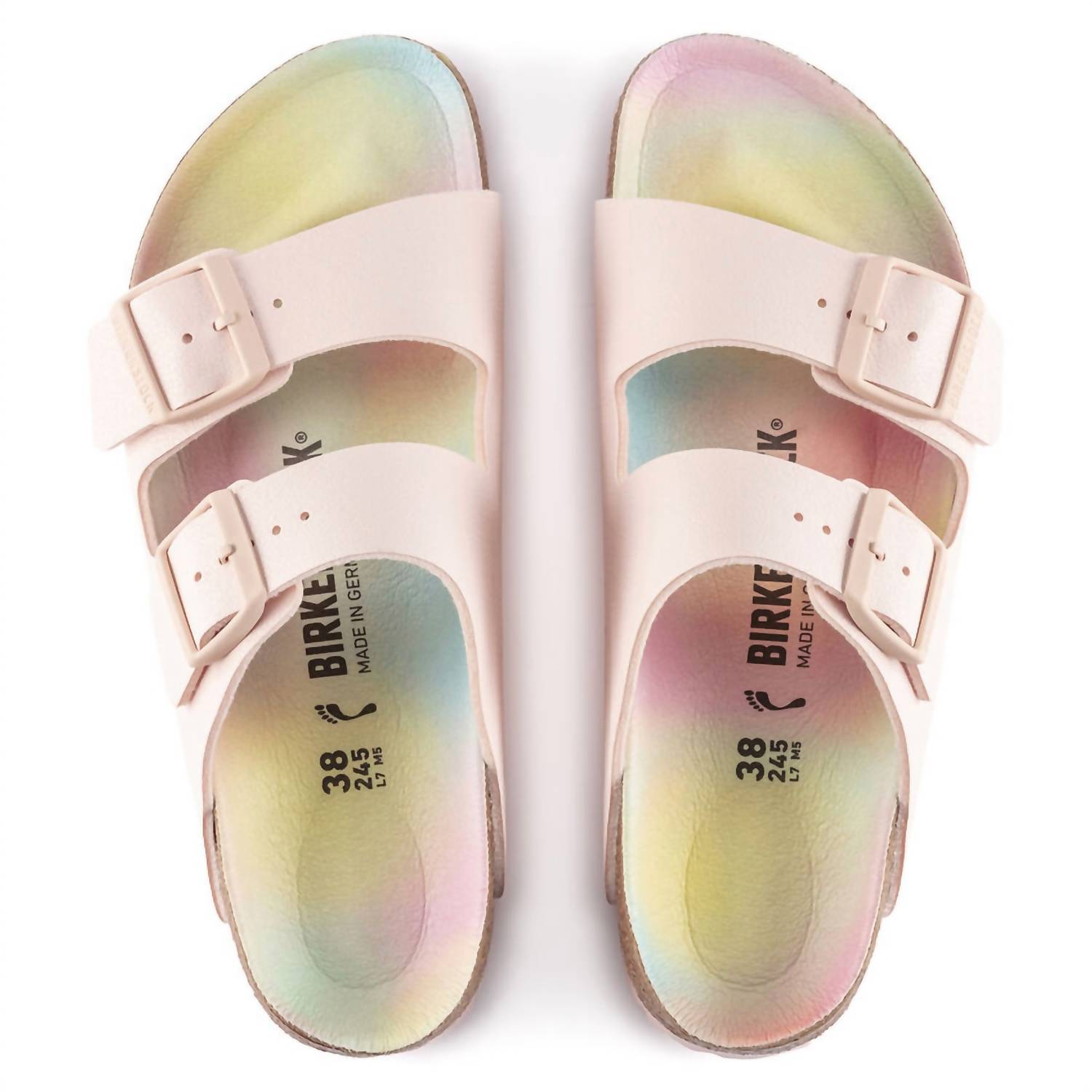 This sandal will take you from brunch to dinner and everything in between. Discover the iconic Women's Arizona Sandal by BIRKENSTOCK, now reimagined in a dazzling Light Rose Vegan finish. Featuring the legendary two-strap design with individually adjustable metal pin buckles, these sandals blend style with comfort. This vegan version boasts a skin-friendly microfiber upper and footbed lining, complemented by an anatomically shaped cork-latex footbed and an EVA sole. Made in Germany, these sandals are perfect for infusing a boho chic vibe into your summer vacation wardrobe.