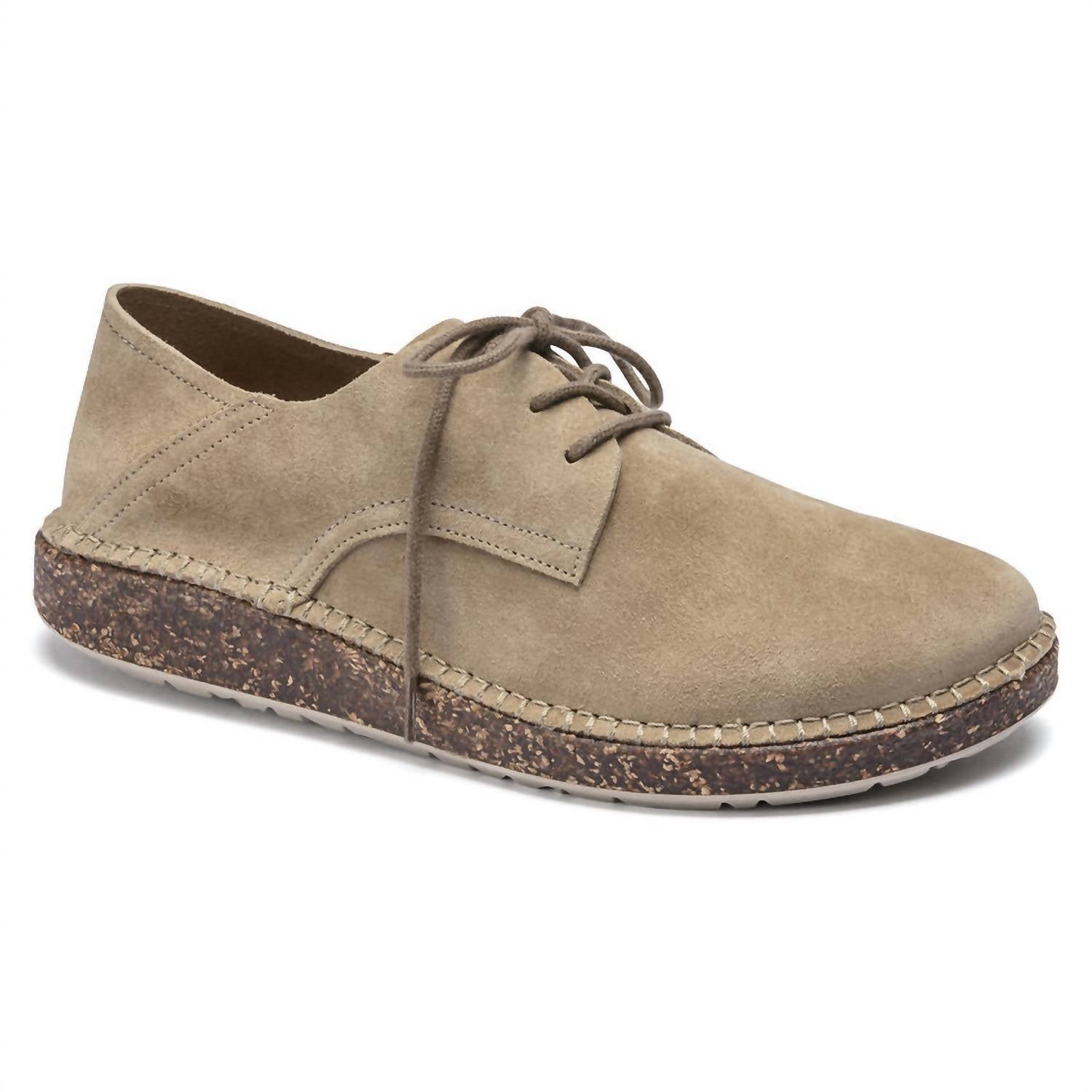 Discover the Women's Gary Lace Up Shoe by BIRKENSTOCK, a versatile piece combining signature style with vintage elegance in a stunning sand color. Crafted from especially soft suede, this design offers the flexibility of a collapsible back for both lace-up and slide options, ensuring ultimate comfort with an anatomically shaped footbed. The footbed is lined with microfiber for added softness, and the durable EVA sole provides reliable support. Proudly made in Portugal, these shoes are perfect for travel and fall occasions with a flat heel and round toe shape.