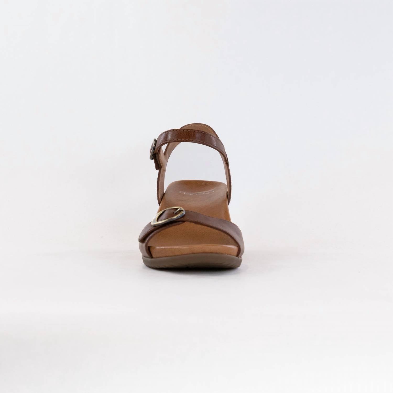 Classicly cute and all-day-wearable. We love this sandal. Elevate your summer wardrobe with the Women's Dansko Arielle Sandals in Tan Glazed Kid Leather. These sandals feature classy leather uppers and a stylish buckle design, perfect for any dinner party or warm-weather occasion. The sandals boast a lightweight BPU wedge with a 2.5-inch heel and a 0.75-inch platform, ensuring both style and comfort. Finished with a TR rubber outsole and a full-grain leather wrapped contoured EVA footbed, these sandals are designed for long-lasting wear, and they carry the APMA Seal of Acceptance for exceptional quality.