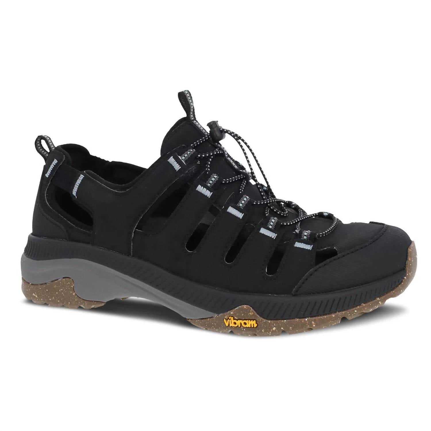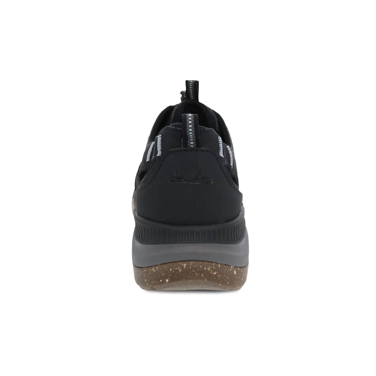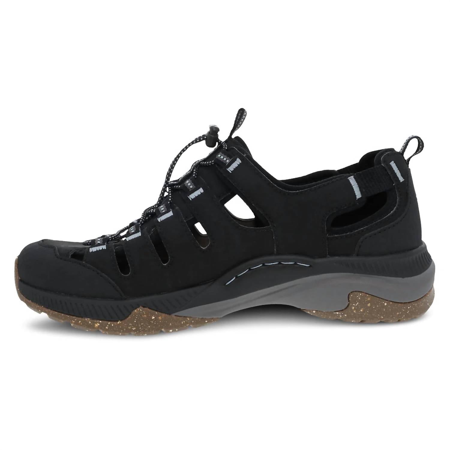 Discover the Women's Mia Shoes by Dansko, a lightweight and durable option perfect for urban exploration or tackling nature trails. These black sandals feature a flat heel and a round toe, crafted with an upper made from 100% recycled PET and lined with moisture-managing, odor-controlling recycled textile. The removable EVA footbed with Dansko Natural Arch Plus™ technology offers exceptional comfort, supported by a lightweight EVA midsole and a slip-resistant Vibram ECOSTEP EVO rubber outsole. Ideal for hiking, these shoes offer toggle adjustability and accommodate most orthotics, making them a versatile choice for the summer season.