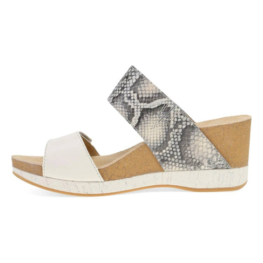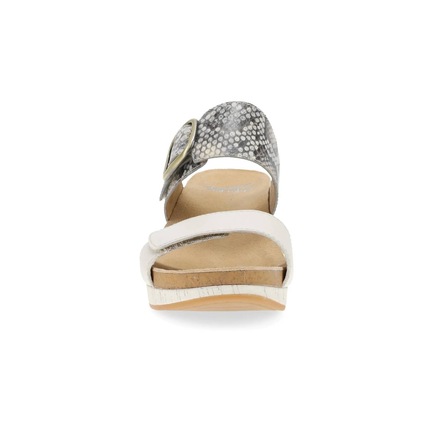 Flowy dresses, cropped pants, and even jumpsuits... this sandal works with them all! Step into effortless style and comfort with the Dansko Women's Shannon Sandal in Leather Snake Ivory, perfect for diverse occasions. This open-toe sandal showcases high-quality nubuck leather treated with 3M Scotchgard™ for stain resistance and features a sleek minimalist design. The cushioned energy-return PU footbed and lightweight BPU midsole with an EVA/cork wedge ensure long-lasting wear, complemented by a durable rubber outsole and hook & loop adjustability. Ideal for summer events like brunches and backyard weddings, this sandal is your go-to choice for elevating your look with confidence.