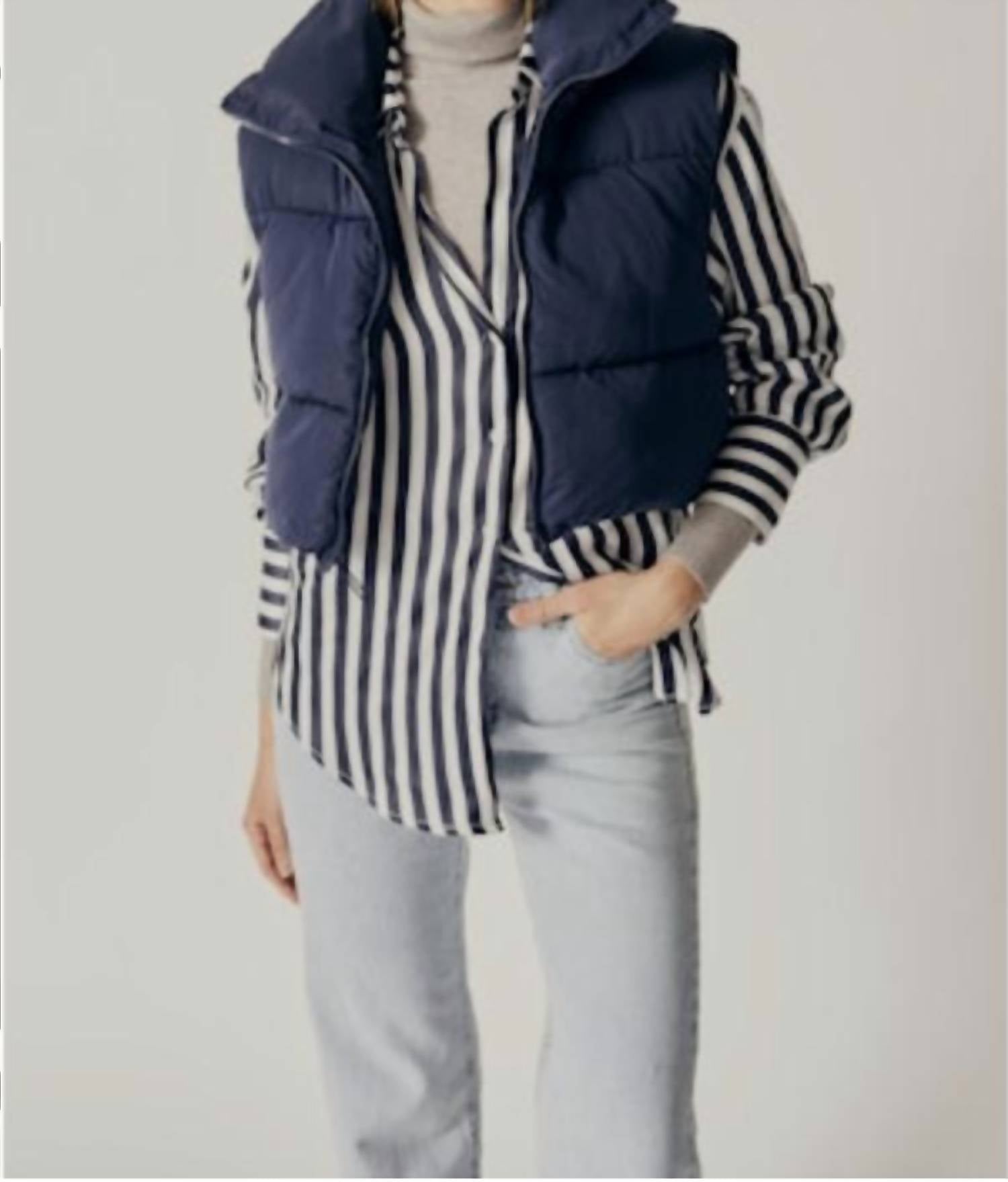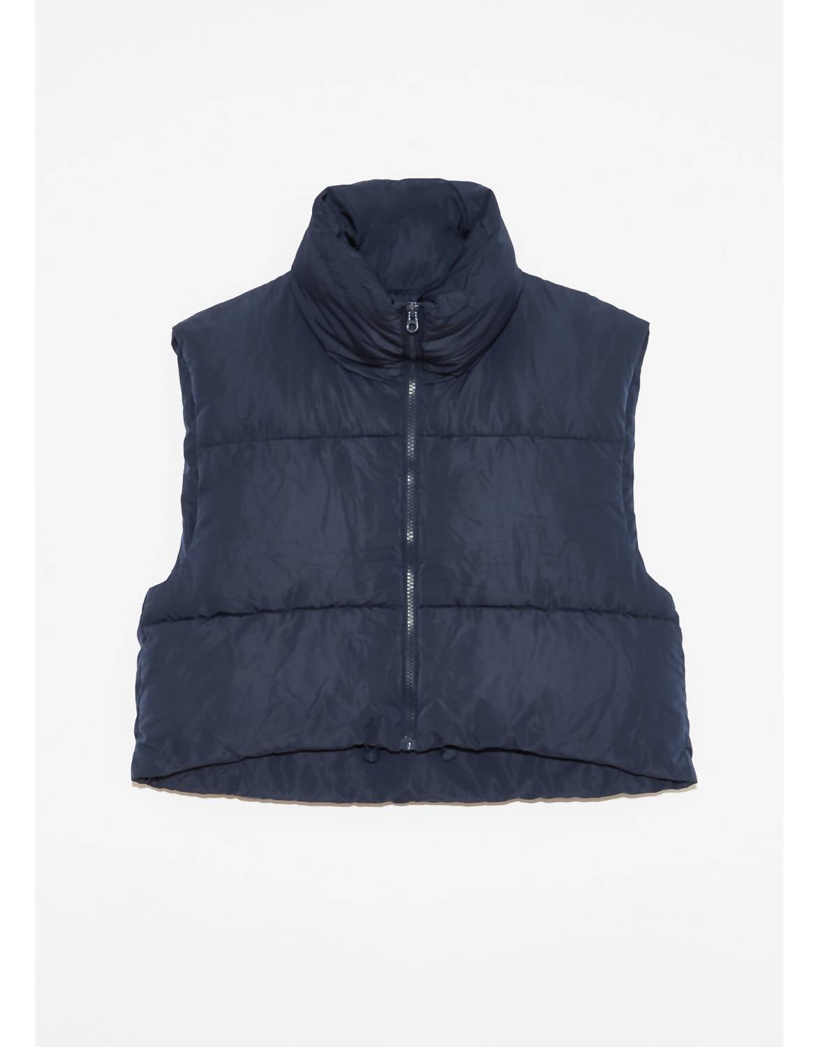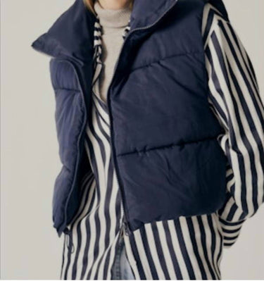 Introducing the Forsythia Puffer Vest by DELUC, a stylish layering option crafted for effortless warmth. This sleeveless vest in sophisticated navy blue is made from durable polyester, perfect for chic layering in cooler seasons. Featuring a collared neckline and practical pockets, it offers both style and functionality. Closure: Zip closure.