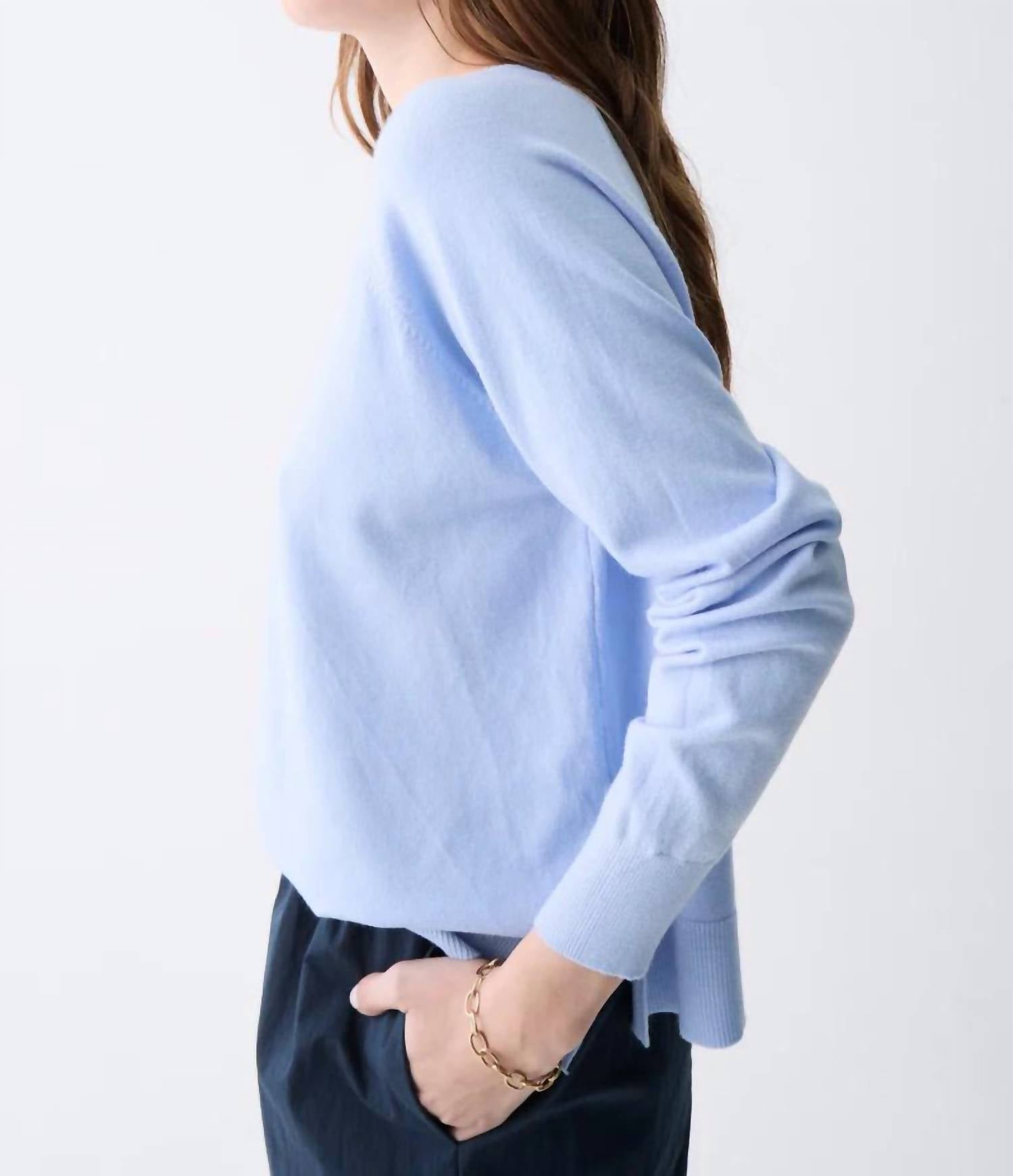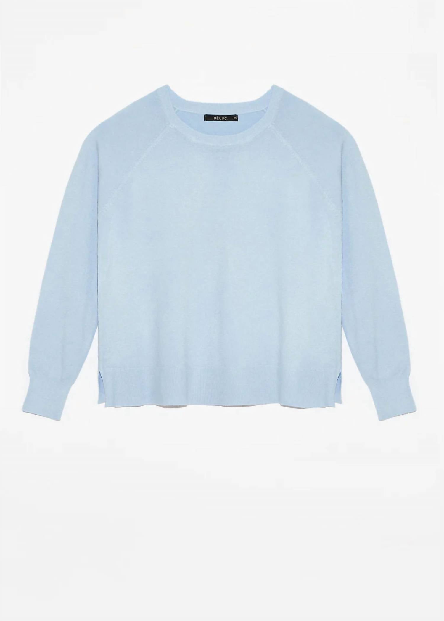 Introducing the Lorraine Long Raglan Sleeves Sweater by DELUC, a minimalist piece in light blue, ideal for a relaxed vacation style. Featuring long raglan sleeves and subtle side slits, this sweater is crafted from 60.8% Viscose/39.2% Polyamide for a comfortable fit. This solid pattern sweater offers a pull-on closure and is easy to care for with a hand wash, lay flat to dry routine. Perfectly suited for fall, it combines classic crewneck elegance with a modern touch.