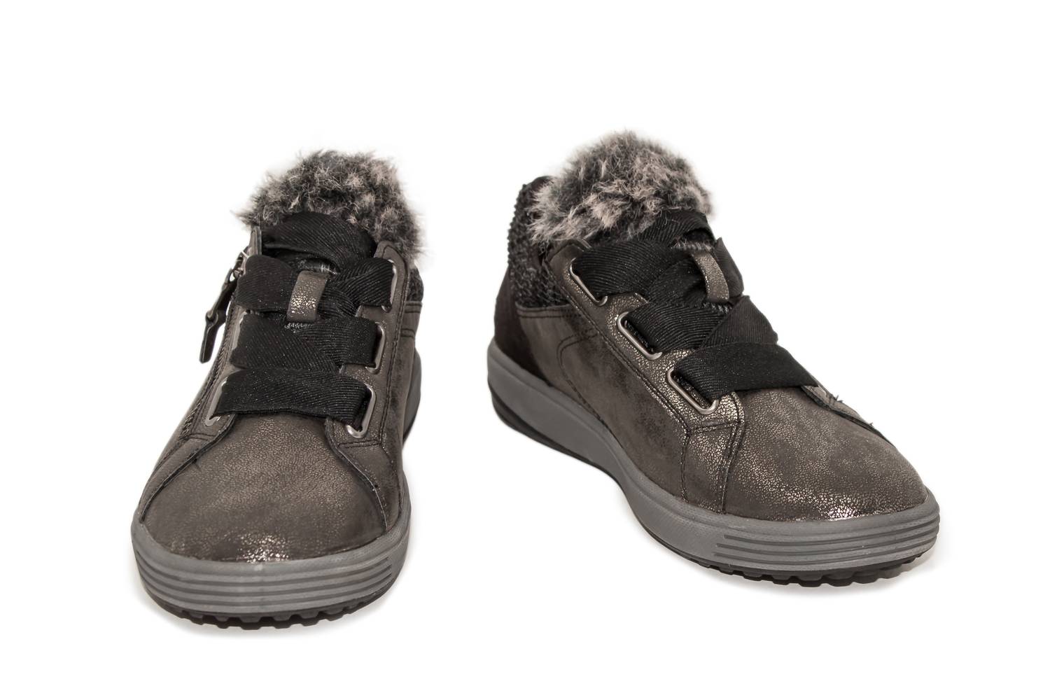 Introducing the Women's Ma Bella Sneaker with Faux Fur by MEPHISTO, perfect for winter travel in style. Showcasing a sophisticated graphite and metallic color, these sneakers feature a round toe design and a flat heel for comfortable wear. With a low heel height of 1 1/4"-2", they offer both elegance and support. Embrace the grunge trend effortlessly with these stunning adult women's sneakers.
