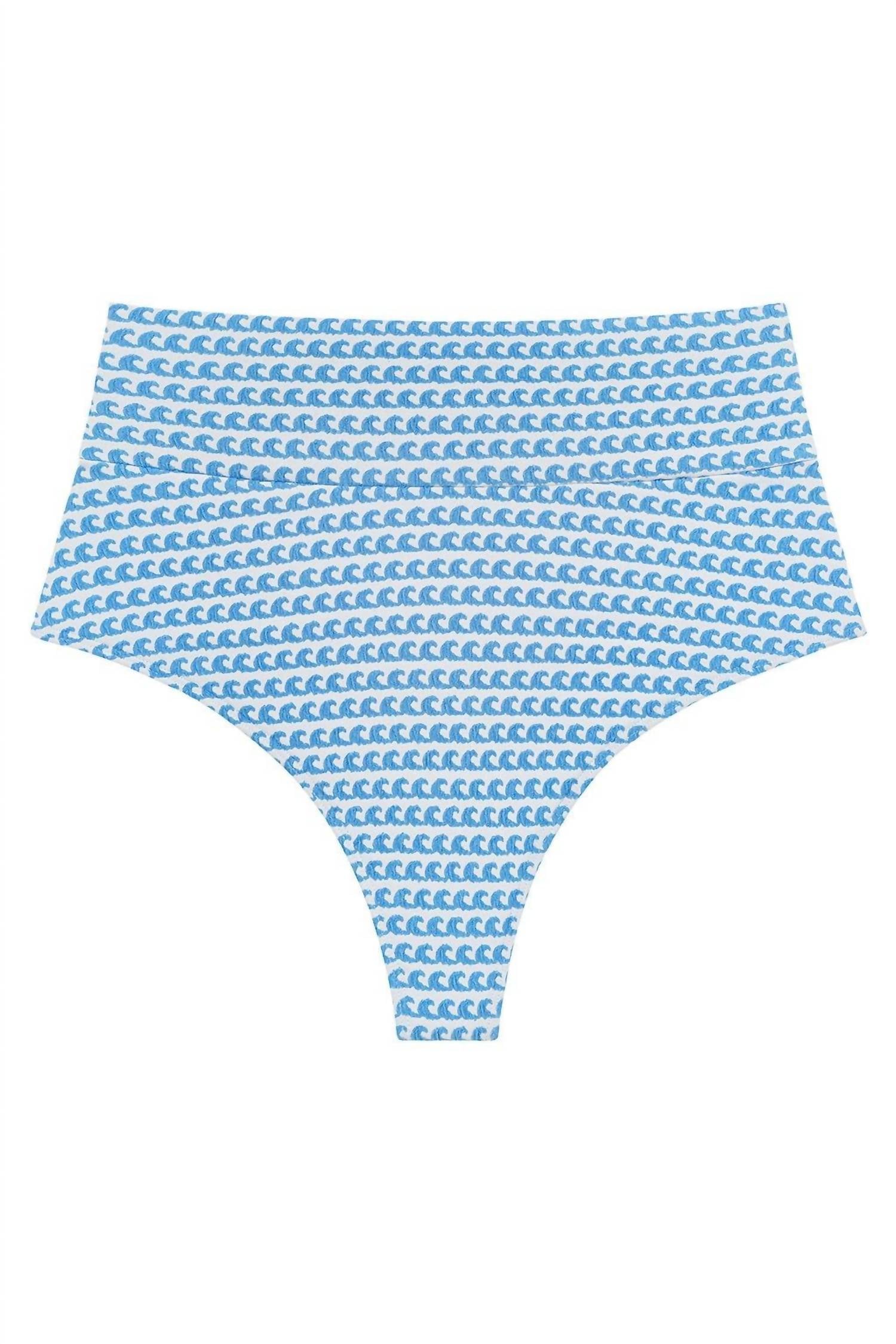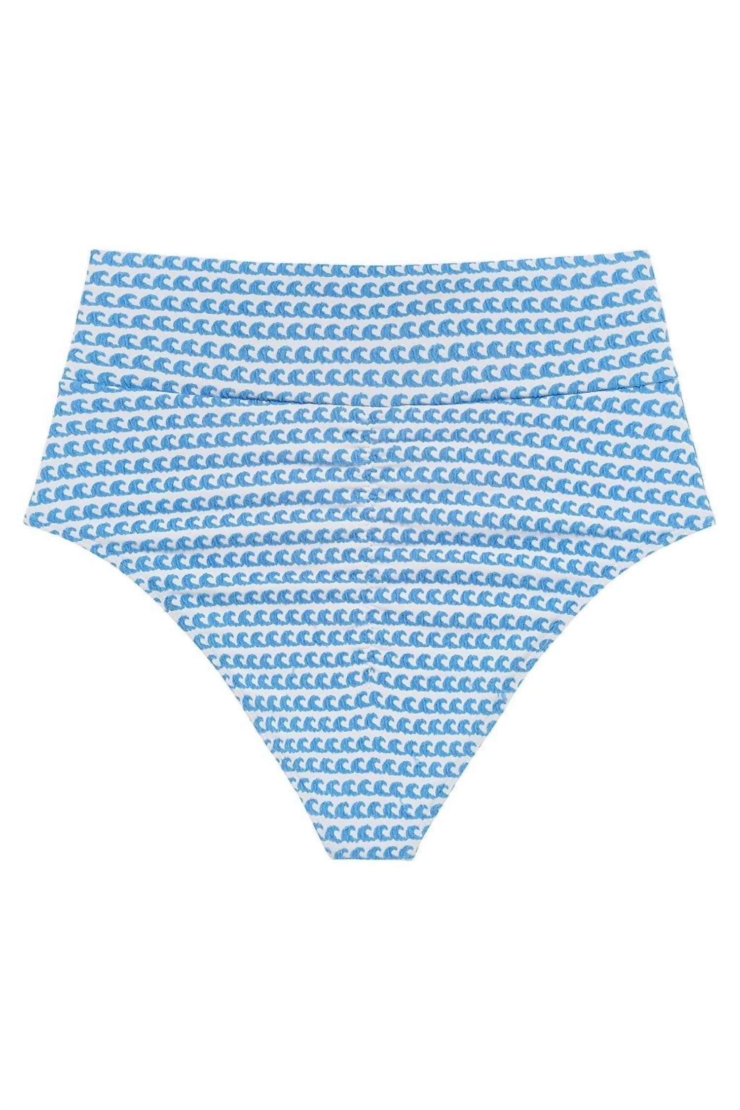 Introducing the Montce Added Coverage High Rise Bikini Bottom in Wave Repeat, crafted to offer full front and moderate back coverage with a stylish high-waisted silhouette. Made from 100% recycled plastic bottles, this patterned swim bottom features a thick, compressive waistband and a ruched back for an accentuated look. Care instructions recommend hand washing due to its delicate fabric. Perfect for a boho chic summer beach day, this piece is ideal for those celebrating the 4th of July in style.