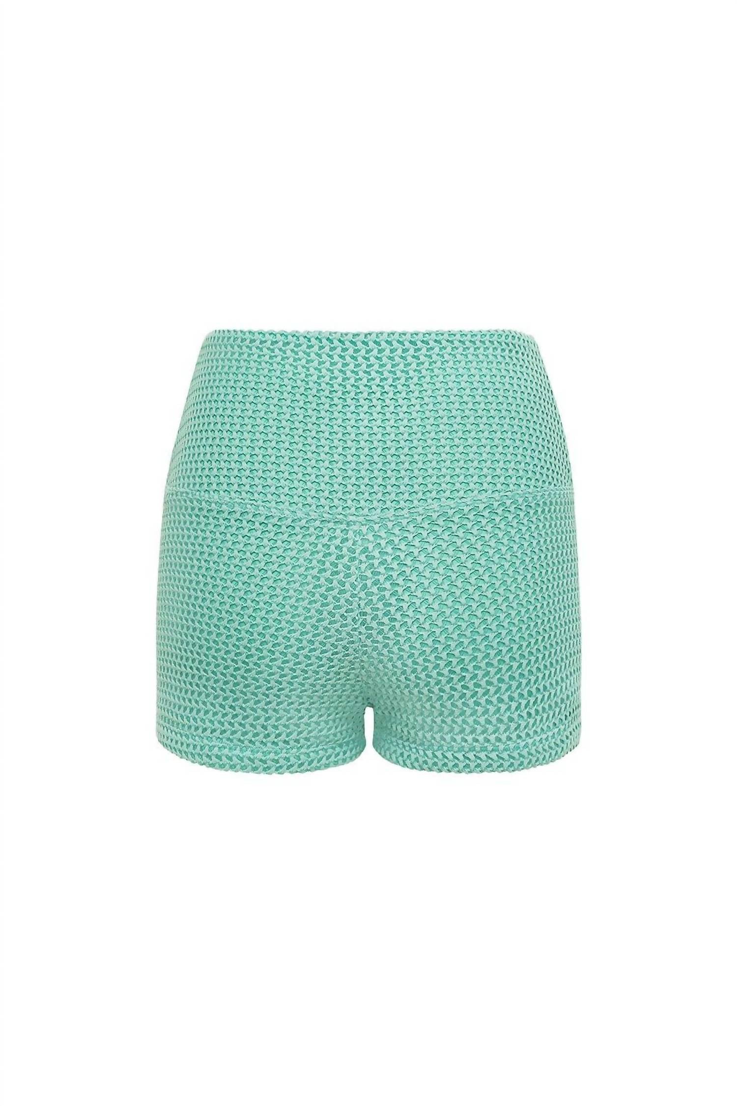 Introducing the Montce Crochet Micro Bike Short, a stylish and versatile piece in vibrant turquoise. These high-rise shorts feature a 2” inseam, light compression, and a wide, contouring waistband, perfect for loungewear, light exercise, or streetwear. With a textured pattern and flat locked seams for extra comfort, these shorts can also double as swim bottoms. Closure: Pull-on. Care: Hand wash.