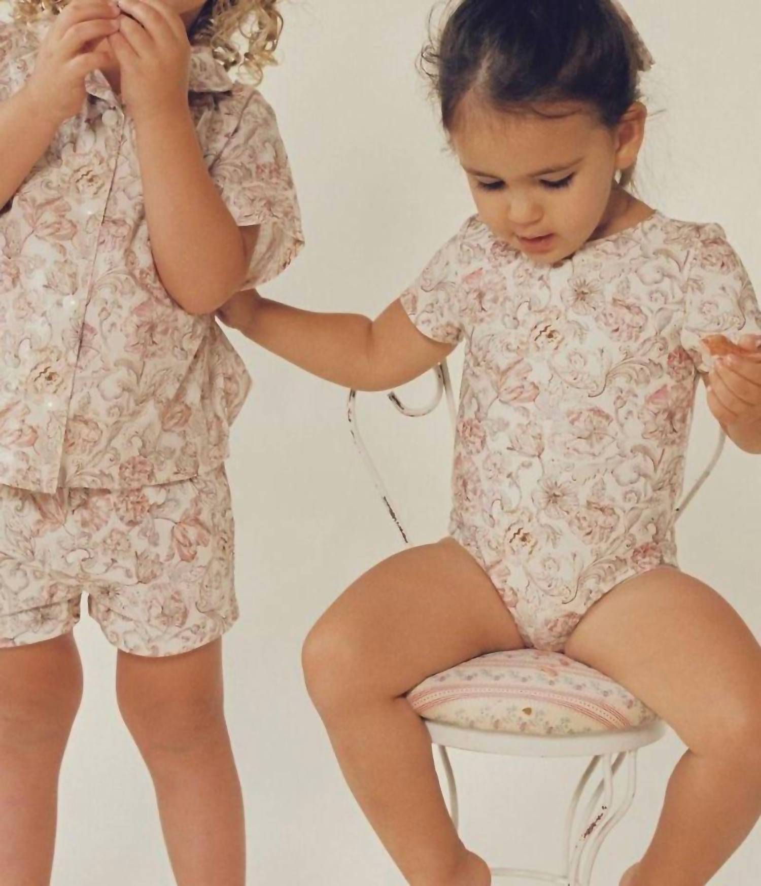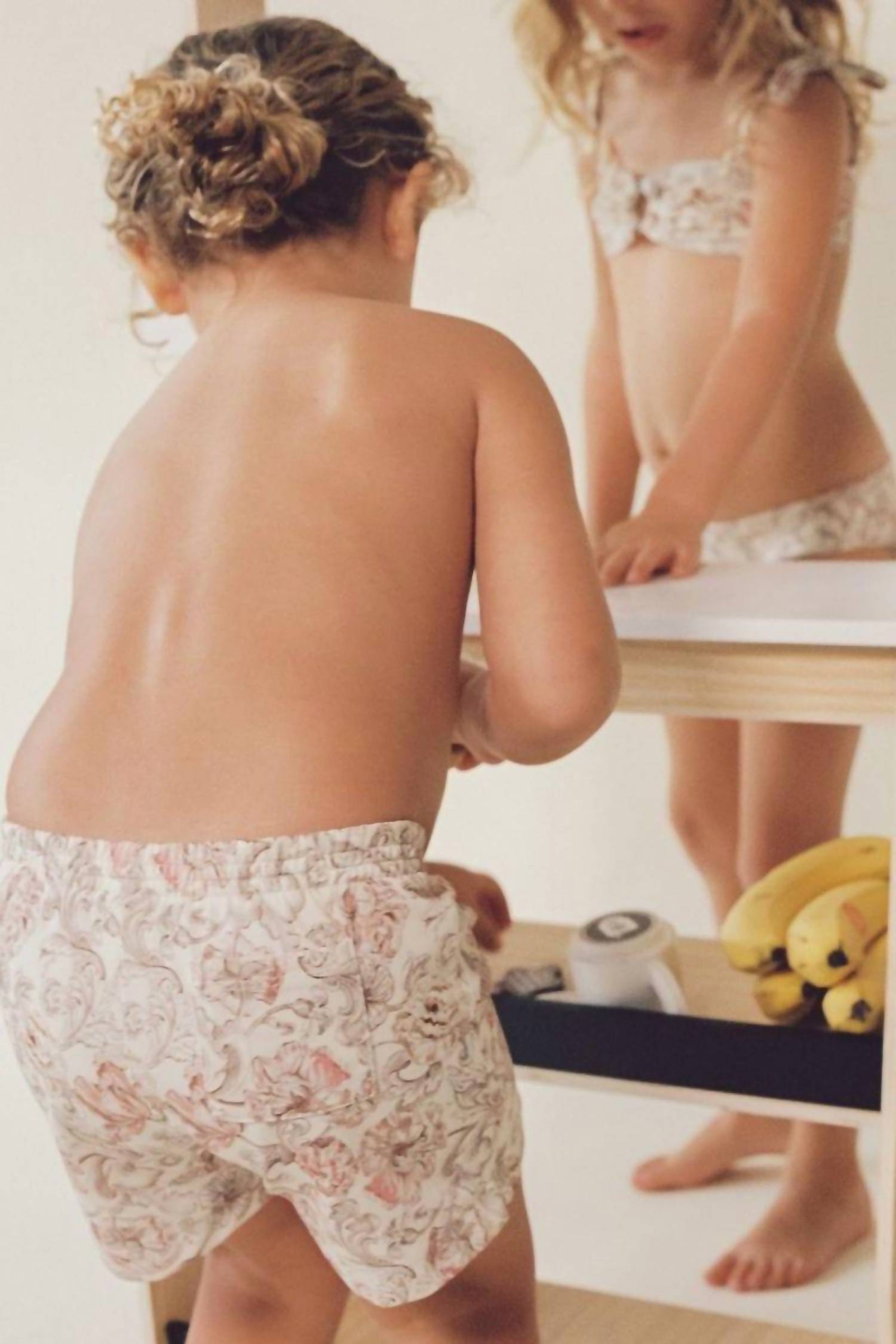 Introducing the Montce Kid's Floral Mini Swim Trunk in Venecia, perfect for a stylish summer vacation. Designed for boys and featuring a boho chic floral pattern, these trunks come equipped with a side vent detail and an accent pocket on the back for added cuteness. Proudly OEKO-TEX Certified with UV Protection UPF 50+, these swim trunks ensure a safe and playful time in the sun. Care instructions recommend machine washing for easy maintenance.