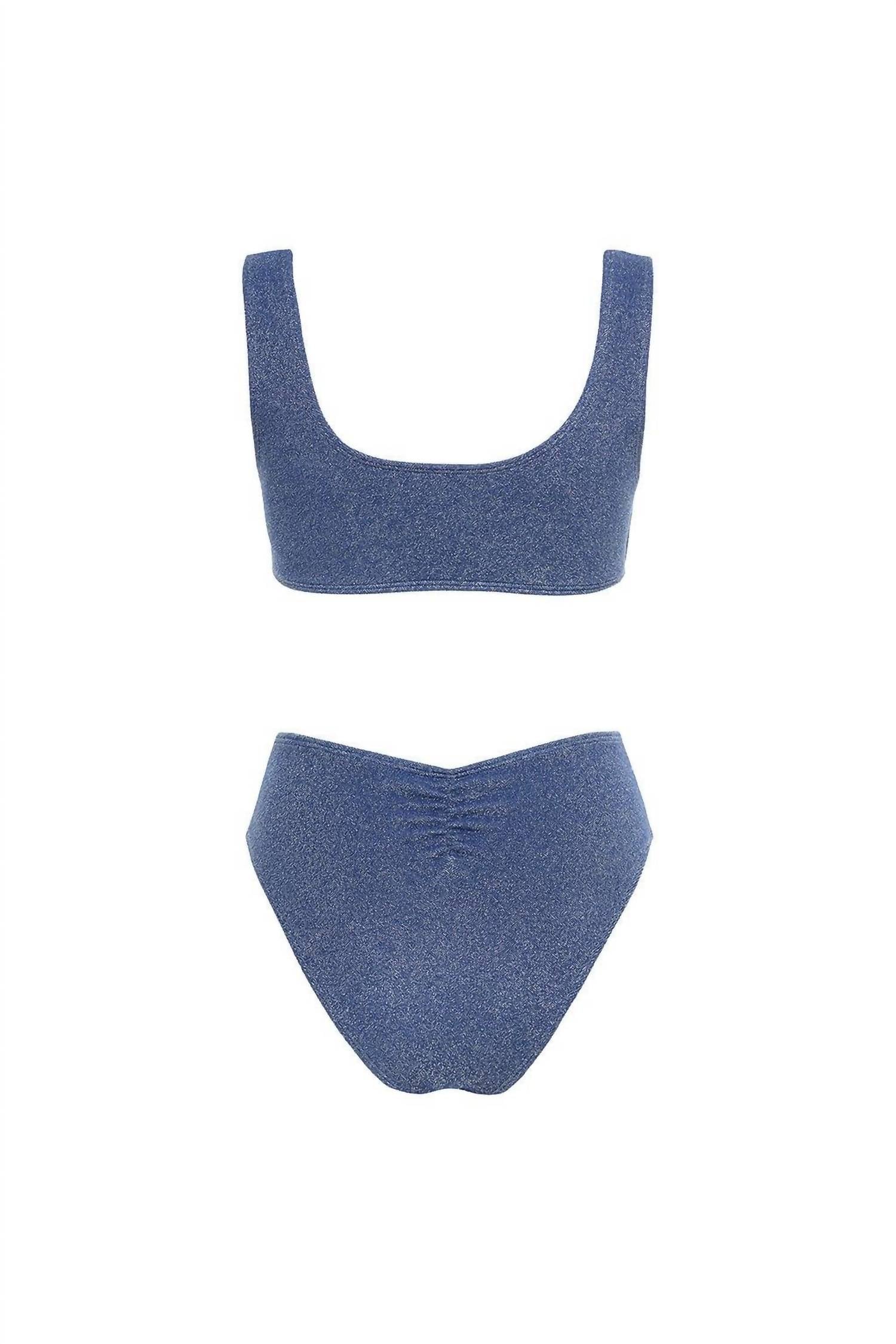 Discover Montce's Ky One-piece Swimsuit in dazzling Sky Sparkle, a minimalist one-piece crafted for your summer beach days. This swimsuit features thick straps for added comfort and a flattering scoop neckline, with chic cut-outs accentuating your curves. The composition includes a blend of 47% Viscose, 27% Polyester, 11% Metallic Fiber, 11% Nylon, and 4% Spandex, with an 80% Nylon and 20% Spandex lining. Care for it by hand washing and line drying, perfect for elongating your legs with its high-cut style and moderate back coverage.