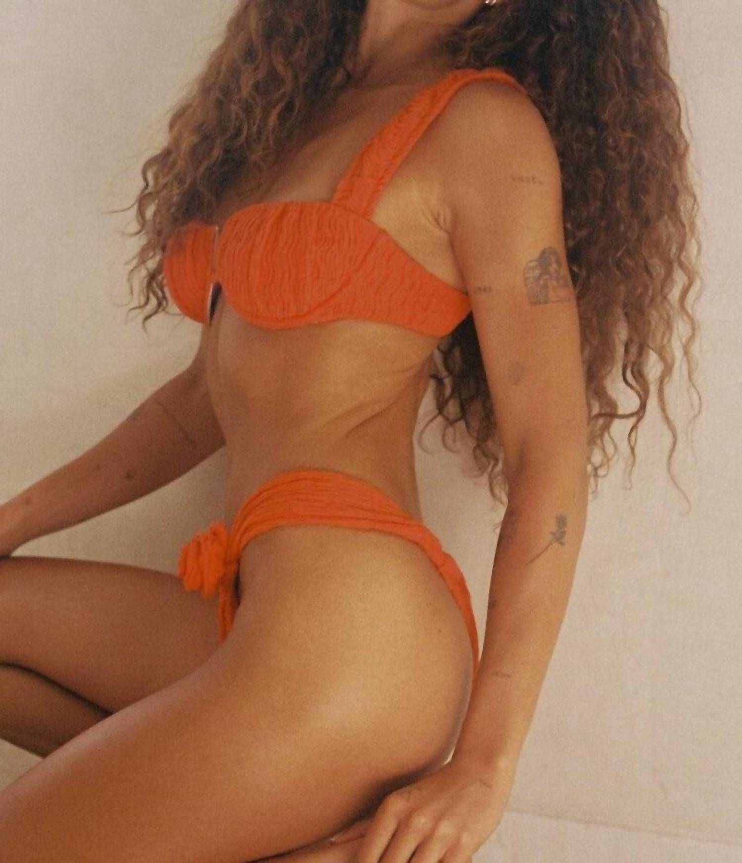 This cute and flattering swimsuit is perfect for making a splash at the pool, lounging on sun-kissed beaches, and staying stylish throughout the upcoming summer season. Dive into summer with the Montce Petal Bikini Top in eye-catching Tangerine, perfect for a sunny beach day. This Bandeau swim top offers moderate bust support with underwire and demi cups, featuring wider shoulder straps for comfort and an adjustable back hook closure. Crafted from 75% Nylon and 25% Spandex, the fabric is imported from Italy and provides UV protection with UPF 50+, ensuring durability and peace of mind. Care is straightforward with a simple hand wash and a textured, minimalist design for chic style.