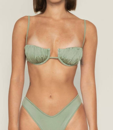 Introducing the Petal Bikini Top by Montce, designed for stylish summer days in a chic Sage Green Rib with a minimalist vibe. This underwire swim top features a demi cup for moderate bust support, adjustable straps, and a convenient back hook closure to ensure a perfect fit. The silky fabric combines 80% nylon and 20% spandex, with OEKO-TEX certification, while the micro rib version uses 90% recycled nylon and 10% spandex, boasting GRS certification. Care for this solid-patterned piece by hand washing it to maintain its understated sheen.