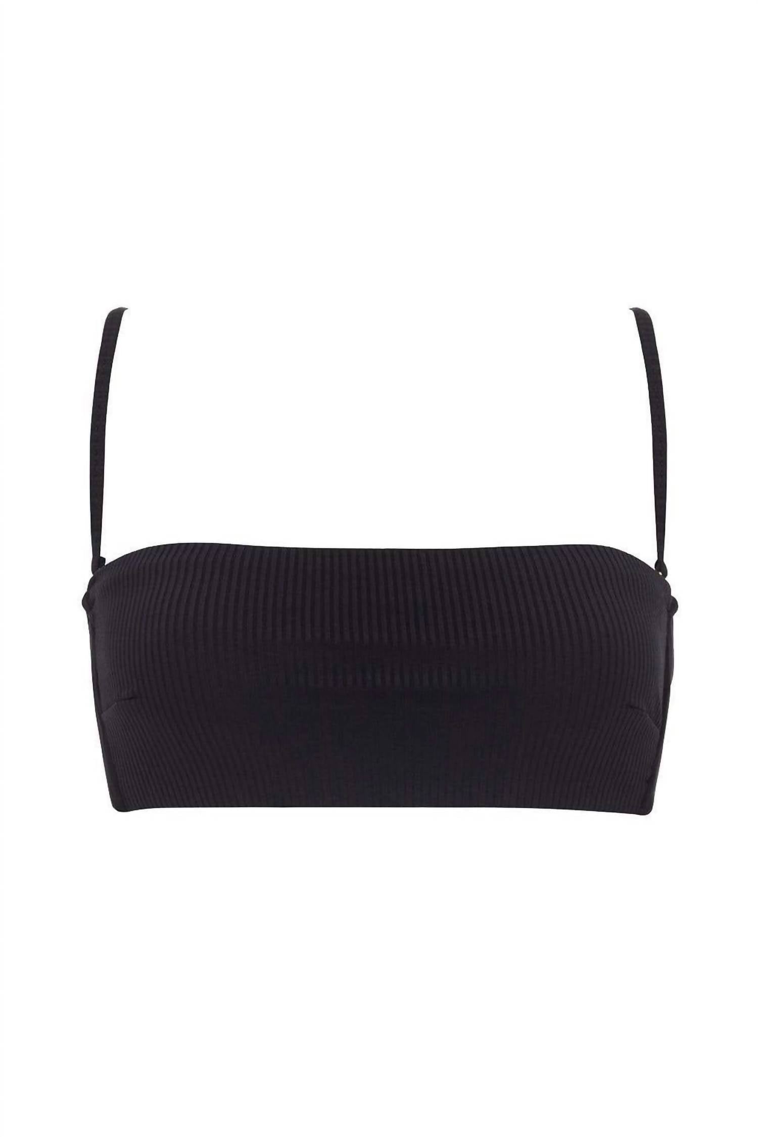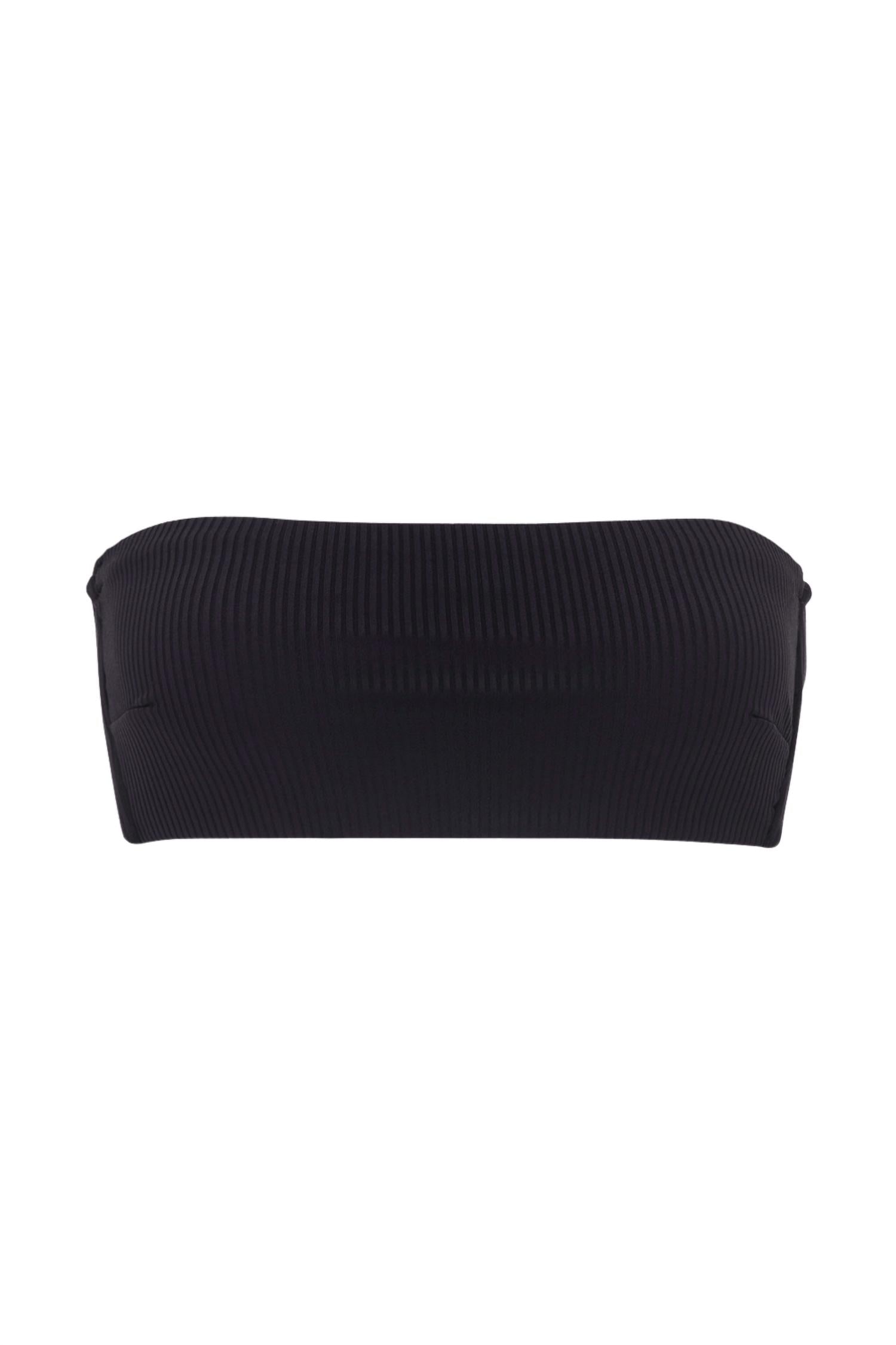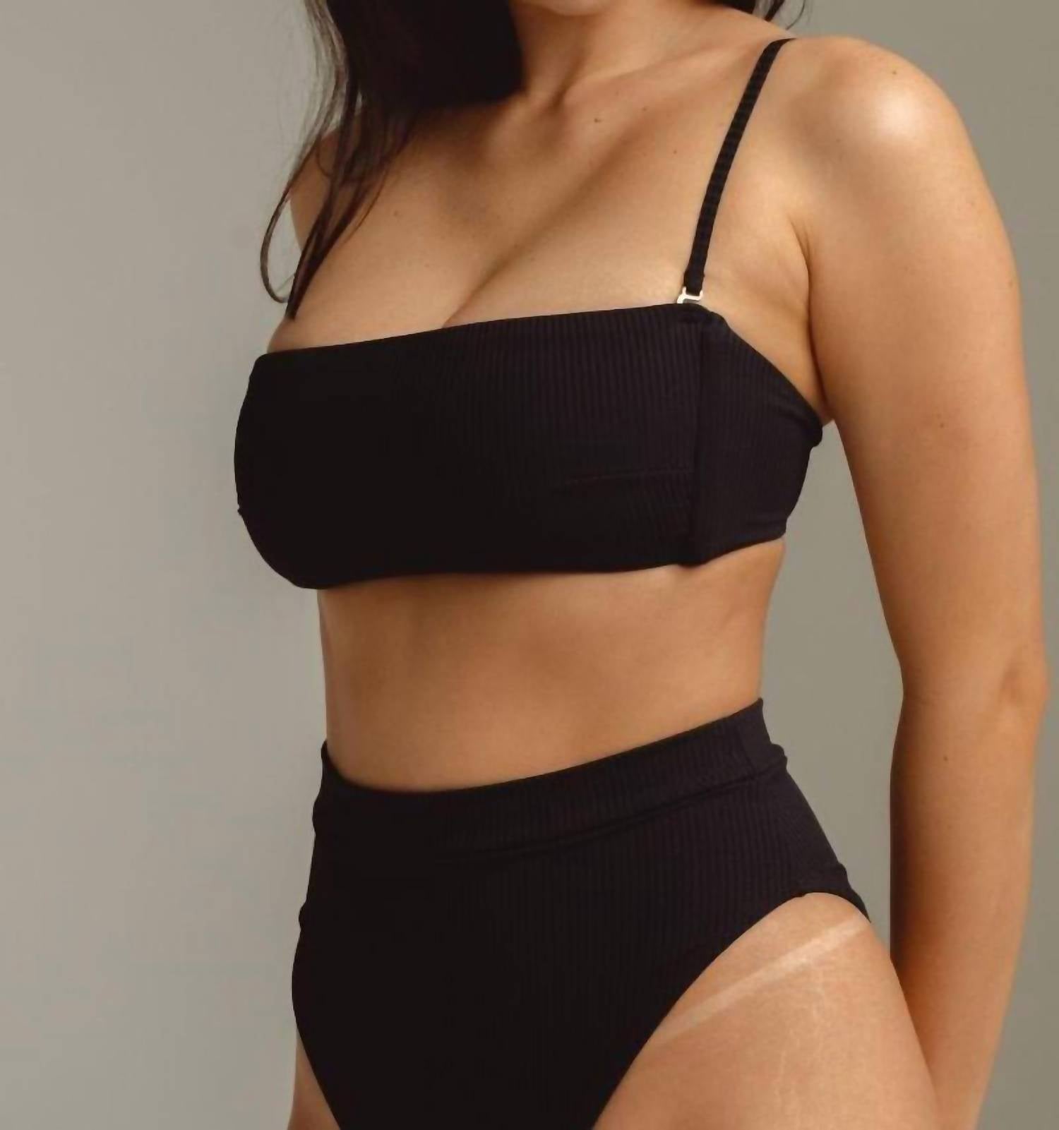 Dream of your next beach getaway in this cute little number. Pair with strappy sandals, a floppy hat, and an oversized tote to complete the perfect vacation look. Embrace beach elegance with the Montce Rib Summer Bikini Top in sleek Black. This strapless bandeau swim top features a flattering straight neckline, adjustable back hook closure, and removable straps, offering medium support with side seam boning. Crafted from a buttery soft and extra stretch ribbed material, this swim top features a durable Nylon/Spandex blend with fabric imported from Brazil, accented with gold tarnish-resistant metal hardware. Ideal for a minimalist look with classic coverage, it ensures minimal tan lines and effortless chic; just hand wash to maintain its pristine condition.