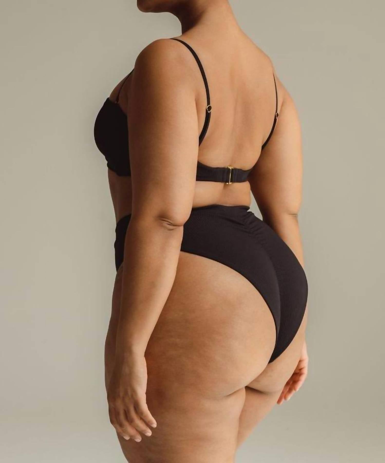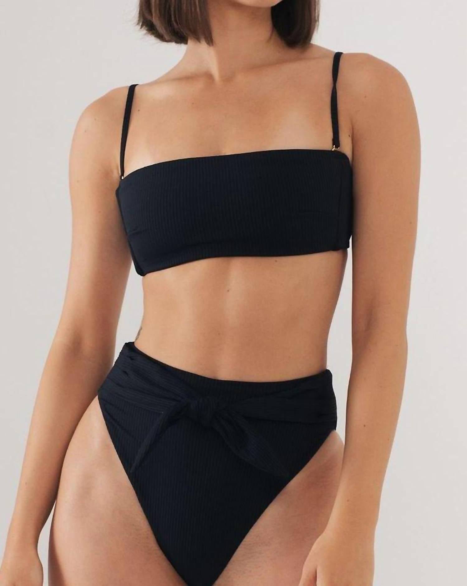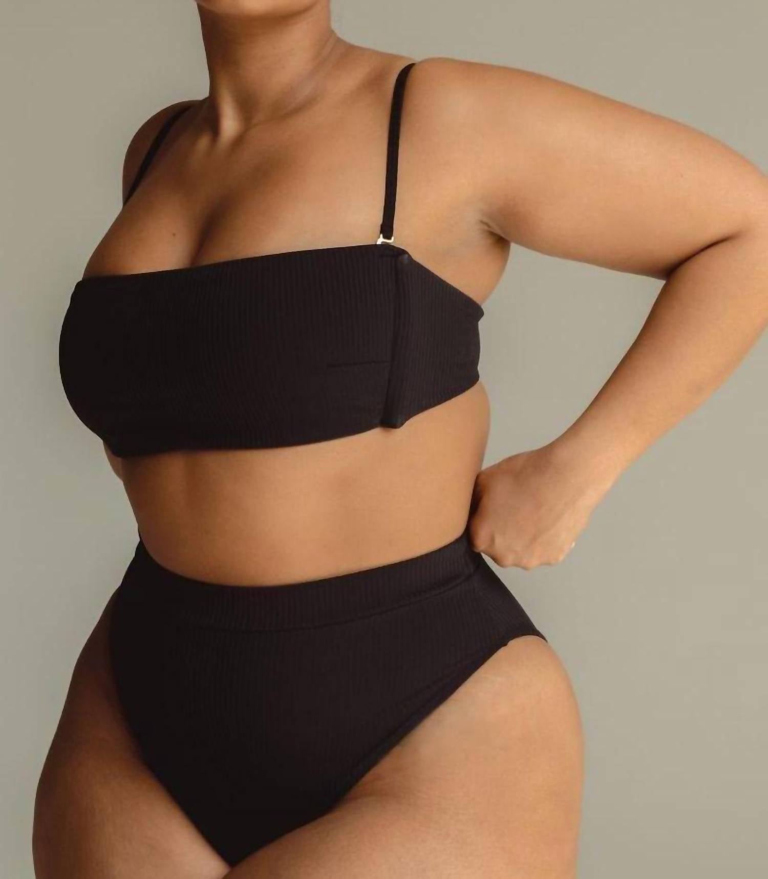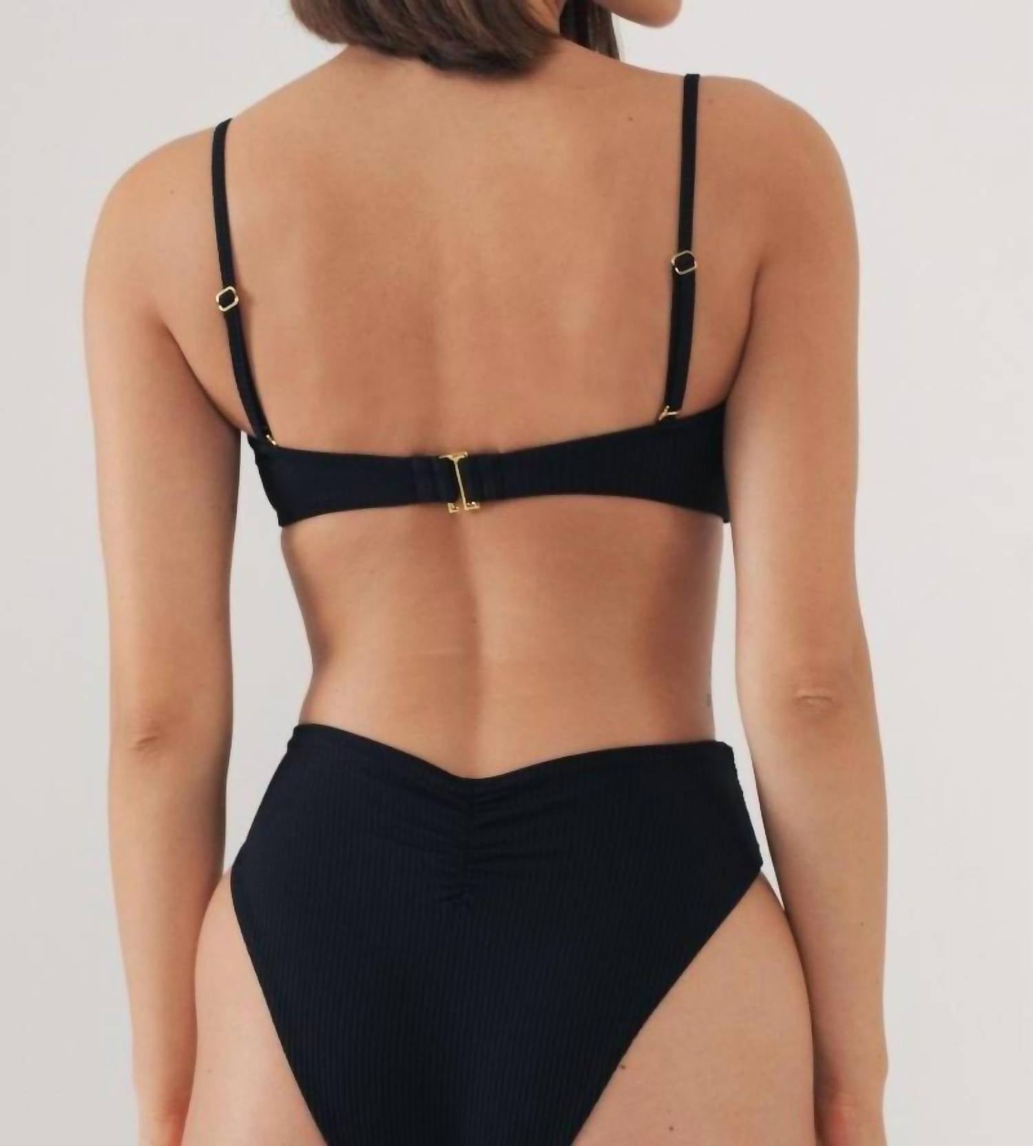 Dream of your next beach getaway in this cute little number. Pair with strappy sandals, a floppy hat, and an oversized tote to complete the perfect vacation look. Embrace beach elegance with the Montce Rib Summer Bikini Top in sleek Black. This strapless bandeau swim top features a flattering straight neckline, adjustable back hook closure, and removable straps, offering medium support with side seam boning. Crafted from a buttery soft and extra stretch ribbed material, this swim top features a durable Nylon/Spandex blend with fabric imported from Brazil, accented with gold tarnish-resistant metal hardware. Ideal for a minimalist look with classic coverage, it ensures minimal tan lines and effortless chic; just hand wash to maintain its pristine condition.