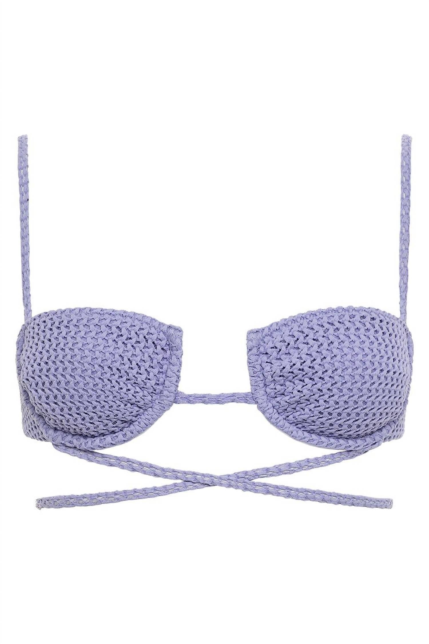 Discover the Simone Underwire Bikini Top by Montce, perfect for your next beach day. This swim top in Lavender Crochet features a medium support design with gathered cups and adjustable shoulder straps. Crafted from a luxurious nylon/spandex blend with Lycra lining, it boasts extra stretch with fabric imported from France and gold tarnish-resistant metal hardware. Closure: Adjustable back hook closure. Care: Hand wash and tumble dry.