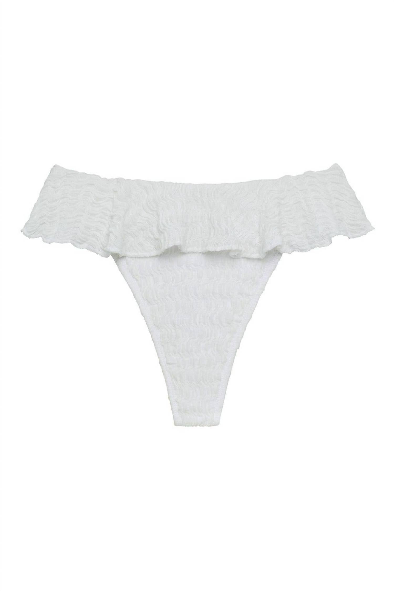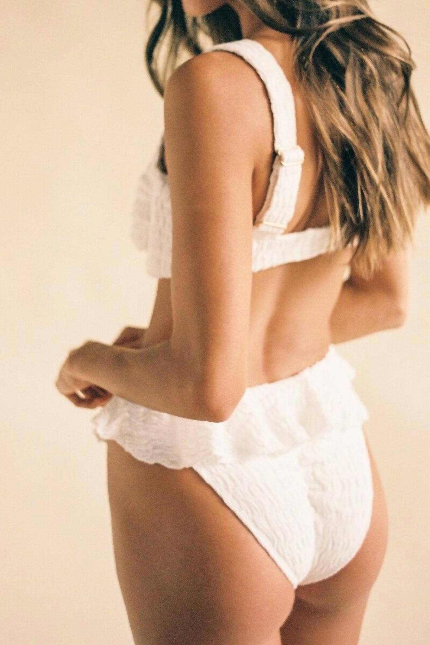 Dream of your next beach getaway in this cute little number. Pair with strappy sandals, a floppy hat, and an oversized tote to complete the perfect vacation look. Introducing the Tamarindo Ruffle Bikini Bottom by Montce in a chic Seychelles hue, designed to sculpt a flattering hourglass shape. This swim bottom features moderate back coverage, a high-leg French cut to elongate the legs, and a ruched back to enhance the booty. Crafted with a delicate Turkish-made blend of 55% Turkish cotton, 40% polyester, and 5% spandex for a textured, minimalist look. Care: Hand wash as the fabric is more delicate than others, ensuring longevity and preserving its aesthetic appeal.