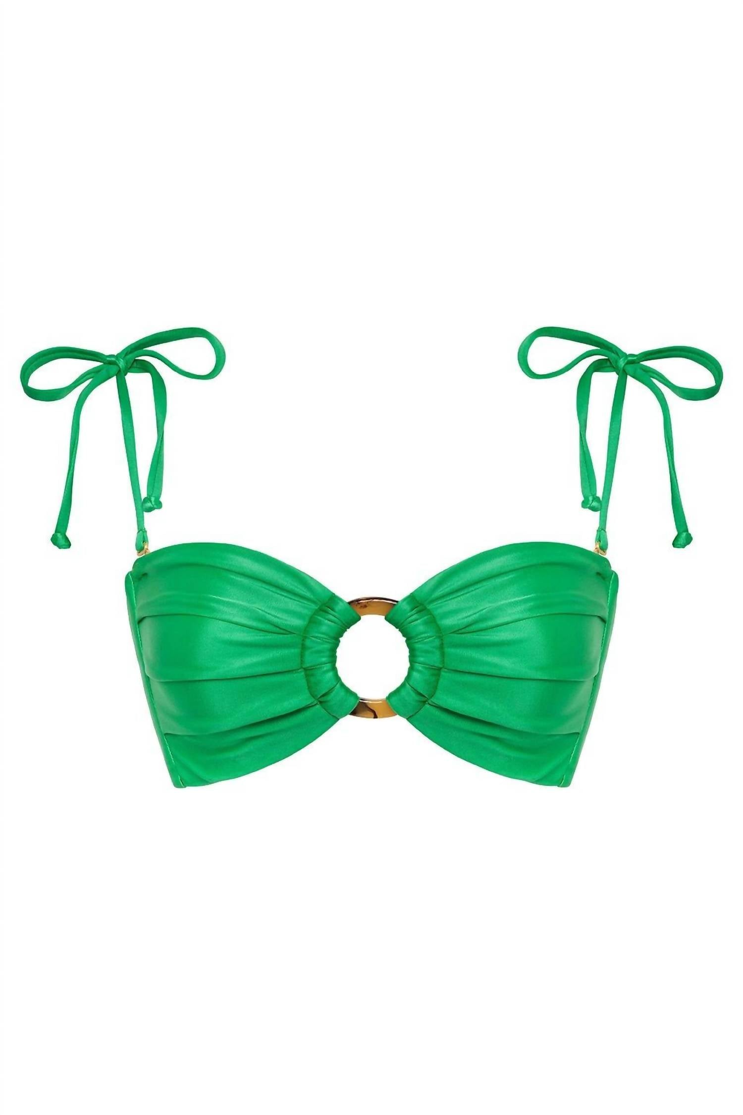 Experience the allure of the Tori Ties Bandeau Bikini Top by Montce, crafted in a shimmering emerald hue. This women's swim top features a bandeau silhouette with a flattering sweetheart neckline and ruching details, offering medium support with side-seam boning for added stability. Composition: 75% Polyester, 25% Spandex, crafted in a knitted style with UV Protection UPF 50+ and OEKO-TEX certification. Closure: Adjustable self-tie back closure. Care: Hand wash and lay flat to dry. Ideal for a chic beach day, this solid-colored piece includes removable tie-up straps for versatile styling.