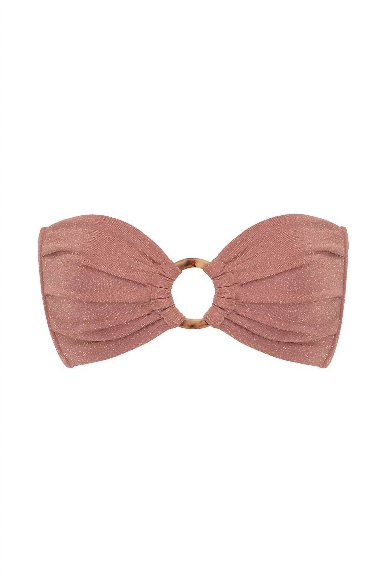 Introducing the Tori Ties Bandeau Bikini Top by Montce, a chic swim staple in a stunning mauve sparkle. This strapless bandeau silhouette features a flattering sweetheart neckline and ruched detailing, perfect for achieving minimal tan lines. Its adjustable self-tie closure and medium support side seam boning ensure a comfortable fit, complemented by the luxe faux tortoise shell hardware. Made from a textured sparkle fabric, a blend of Viscose, Lurex, Polyester, and Spandex, and imported from Bulgaria, this piece requires hand washing to maintain its charm for many beach days to come.