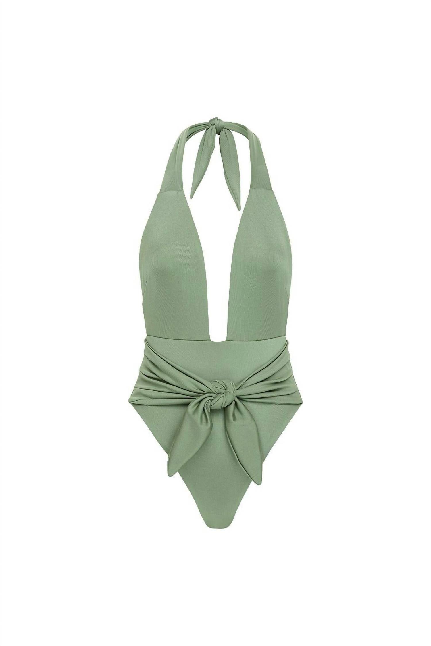 This one piece fits like a glove and covers all the right areas. Elevate your beachwear collection with the Tropez Tie-up One-piece Swimsuit by Montce in a sophisticated sage green rib. This women's swimsuit offers light support, moderate bottom coverage, and thick straps, providing comfort and style with its deep plunging neckline and open back. Crafted from a luxurious silky fabric composed of 80% nylon and 20% spandex with Lycra for a subtle sheen, the swimsuit includes an oversized self-tie bow at the waist and ties at the neck for a customizable fit. Certified by OEKO-TEX and with micro rib fabric made of 90% recycled nylon and 10% spandex, this chic piece is GRS certified and perfect for a summer beach day. Care: Hand wash only.