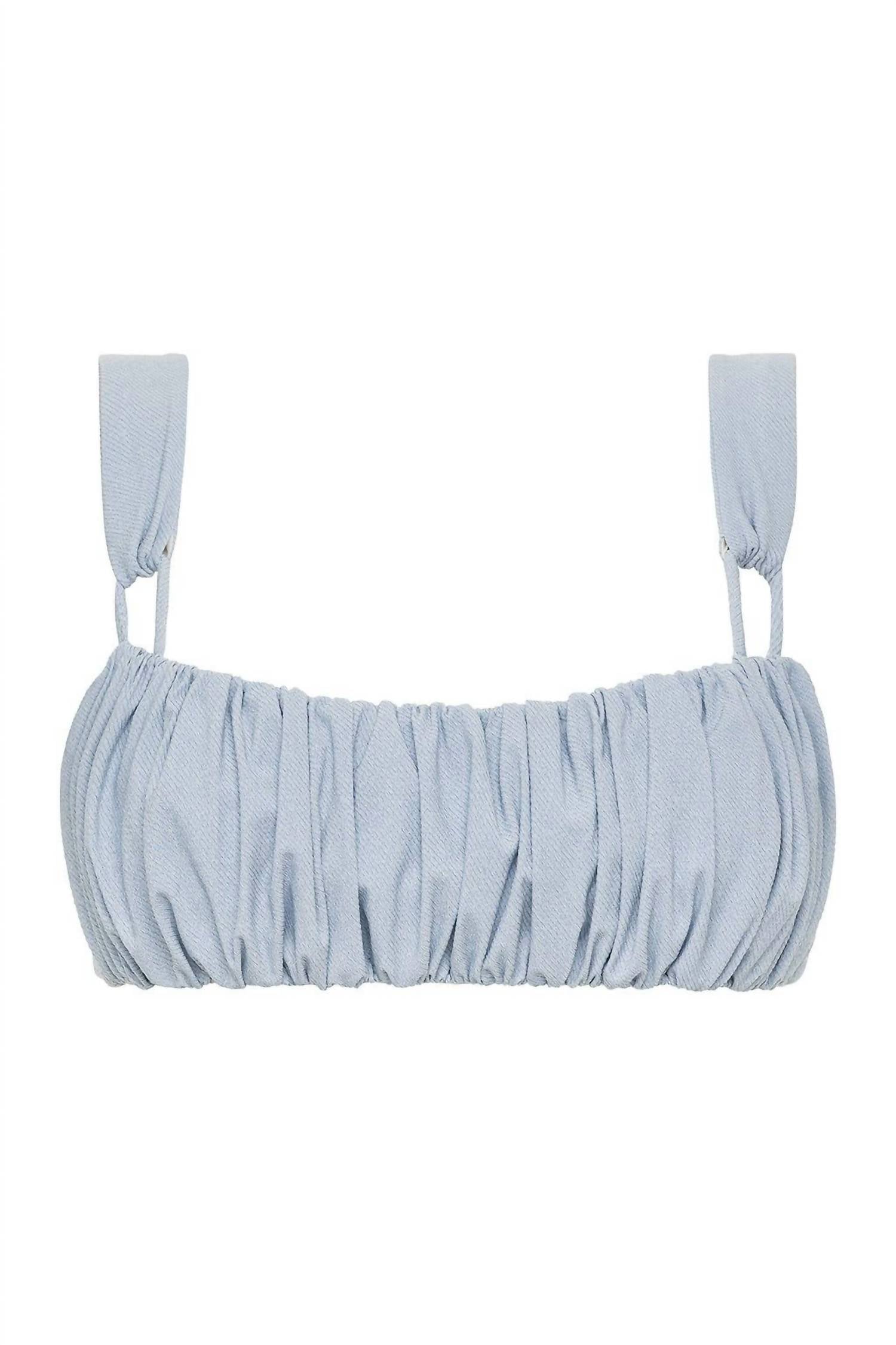 Introducing the Victoria Bikini Top by Montce, a chic swim top in a light denim hue perfect for a beach day under the sun. This bandeau style features strategic ruching to enhance your bust and gold tarnish-resistant hardware for a touch of elegance. Composition: 60% Nylon, 30% Polyester, 10% Spandex—fabric imported from Italy. Closure: Adjustable back hook for a secure fit. Care: Hand wash only.