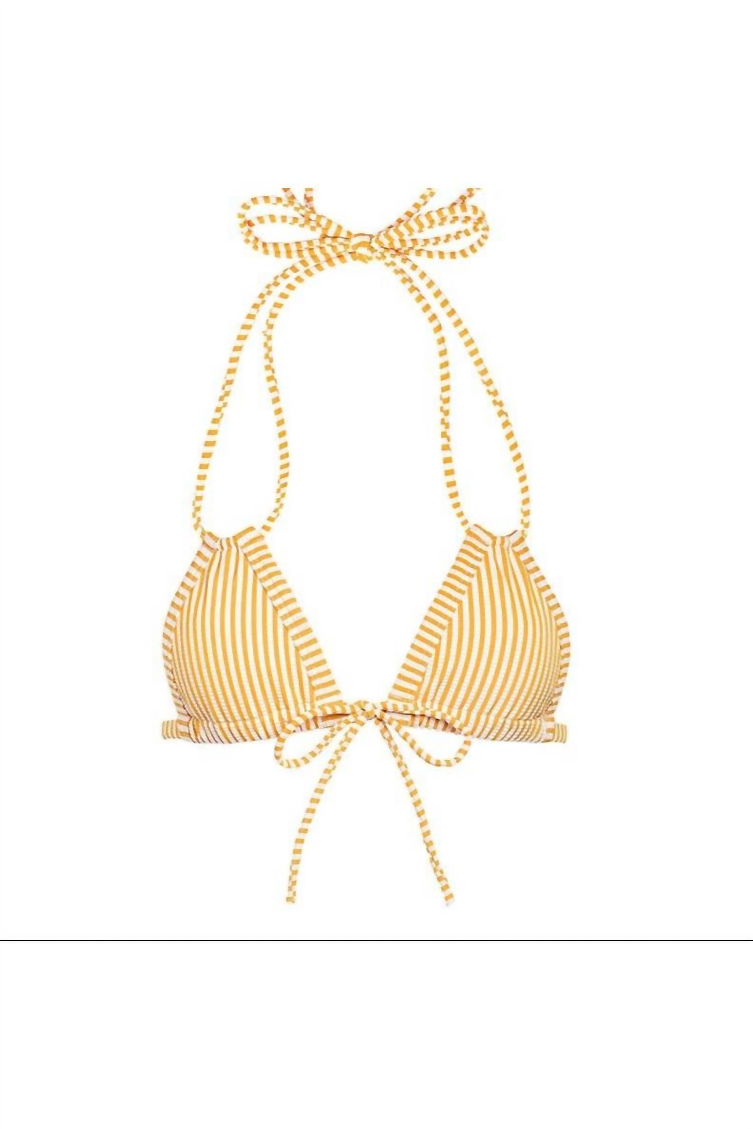 Ideal for relaxed poolside moments, this adorable swimsuit effortlessly transitions into the perfect sunset dinner outfit when paired with a flowing skirt. Embrace beach-day elegance with the Women's Euro Bow Bikini Top by Montce, featuring a chic Canary Stripe design. This stylish swim top in a polyester/nylon/spandex blend offers medium support with its double halter straps, and the adjustable cups and ties at the neck and back ensure a perfect fit. Crafted from seersucker material imported from Italy, this bikini top channels 90s fashion vibes with its removable bow detail and padding insert pocket. Care for it with hand washing to maintain its vibrant style all summer long.