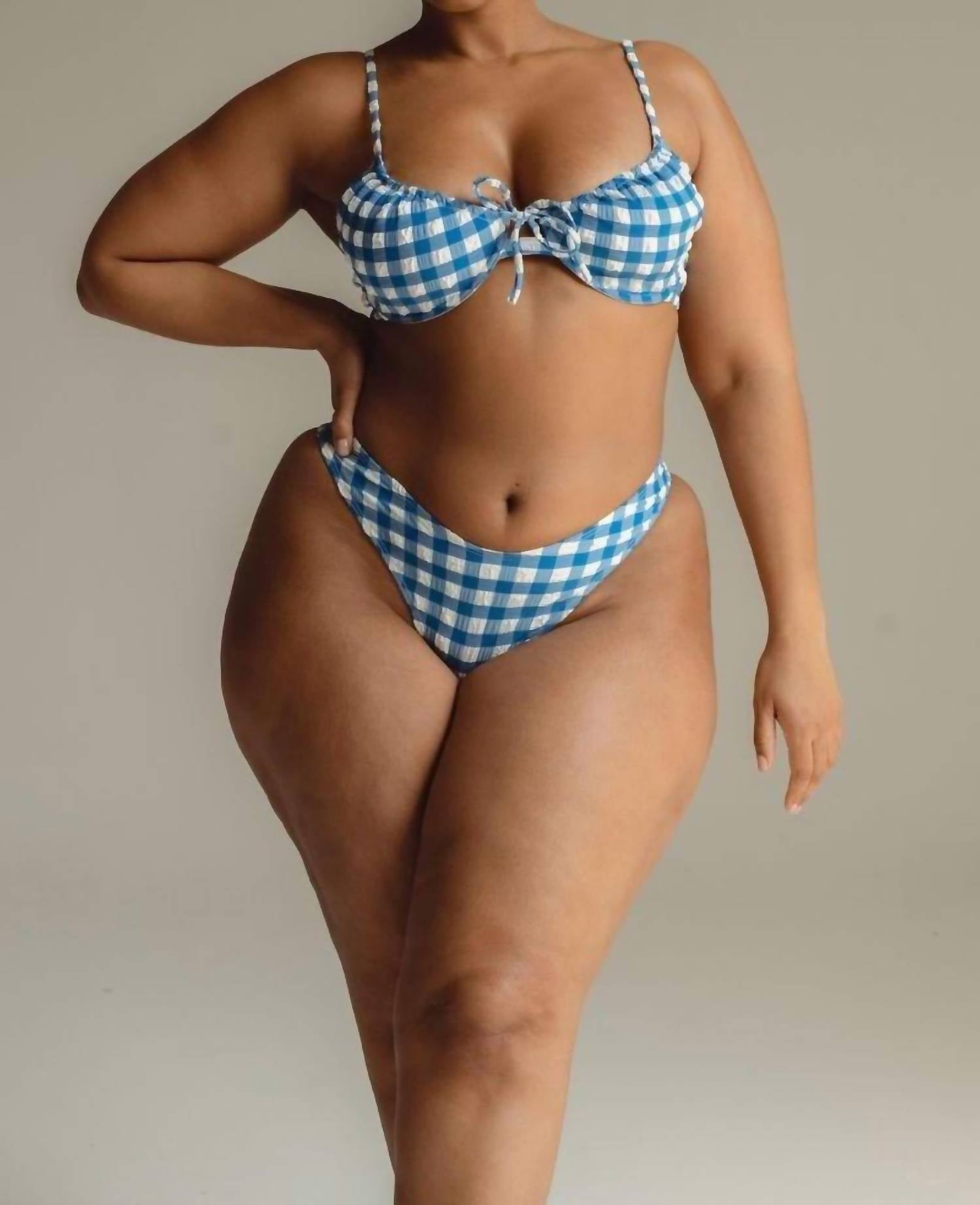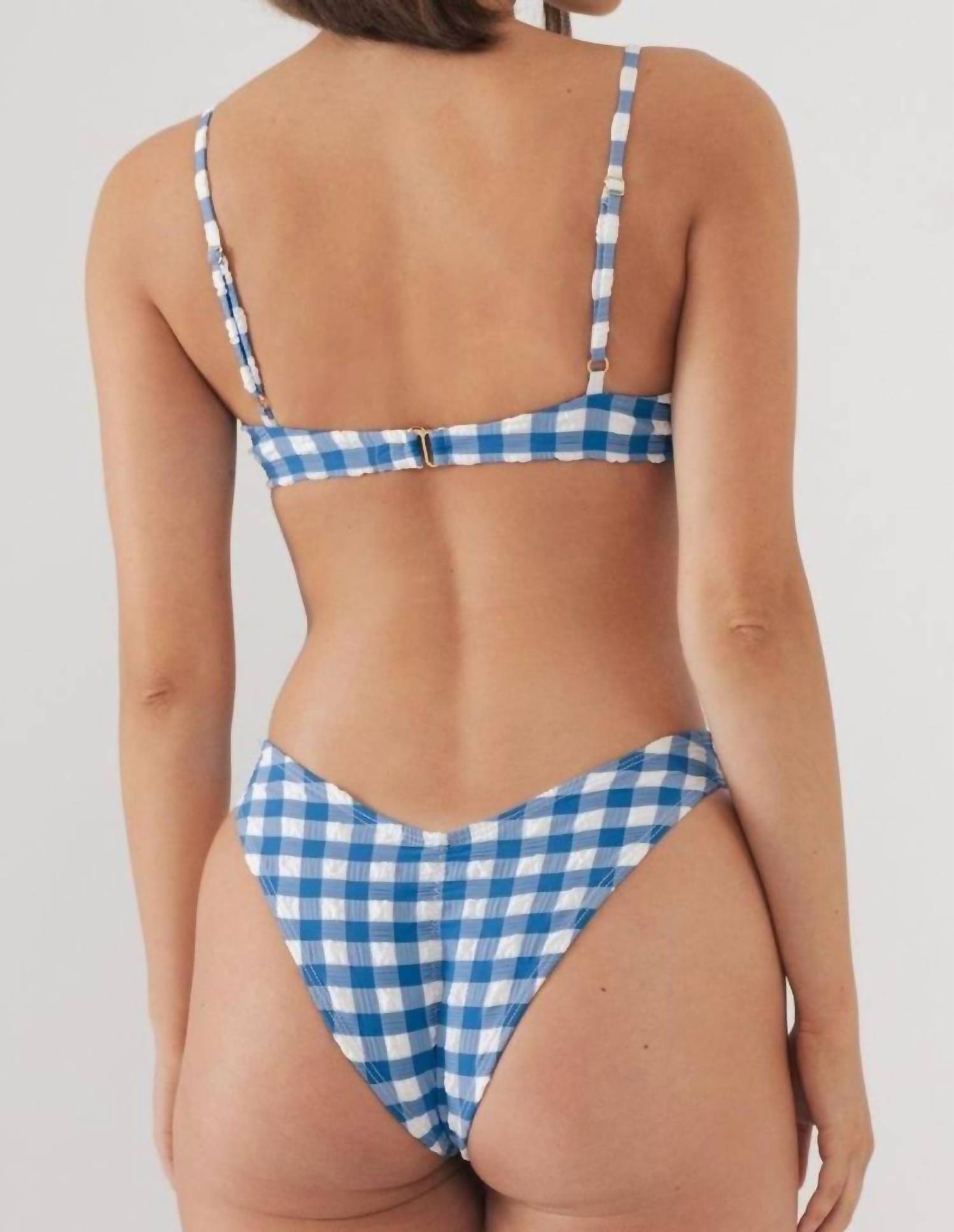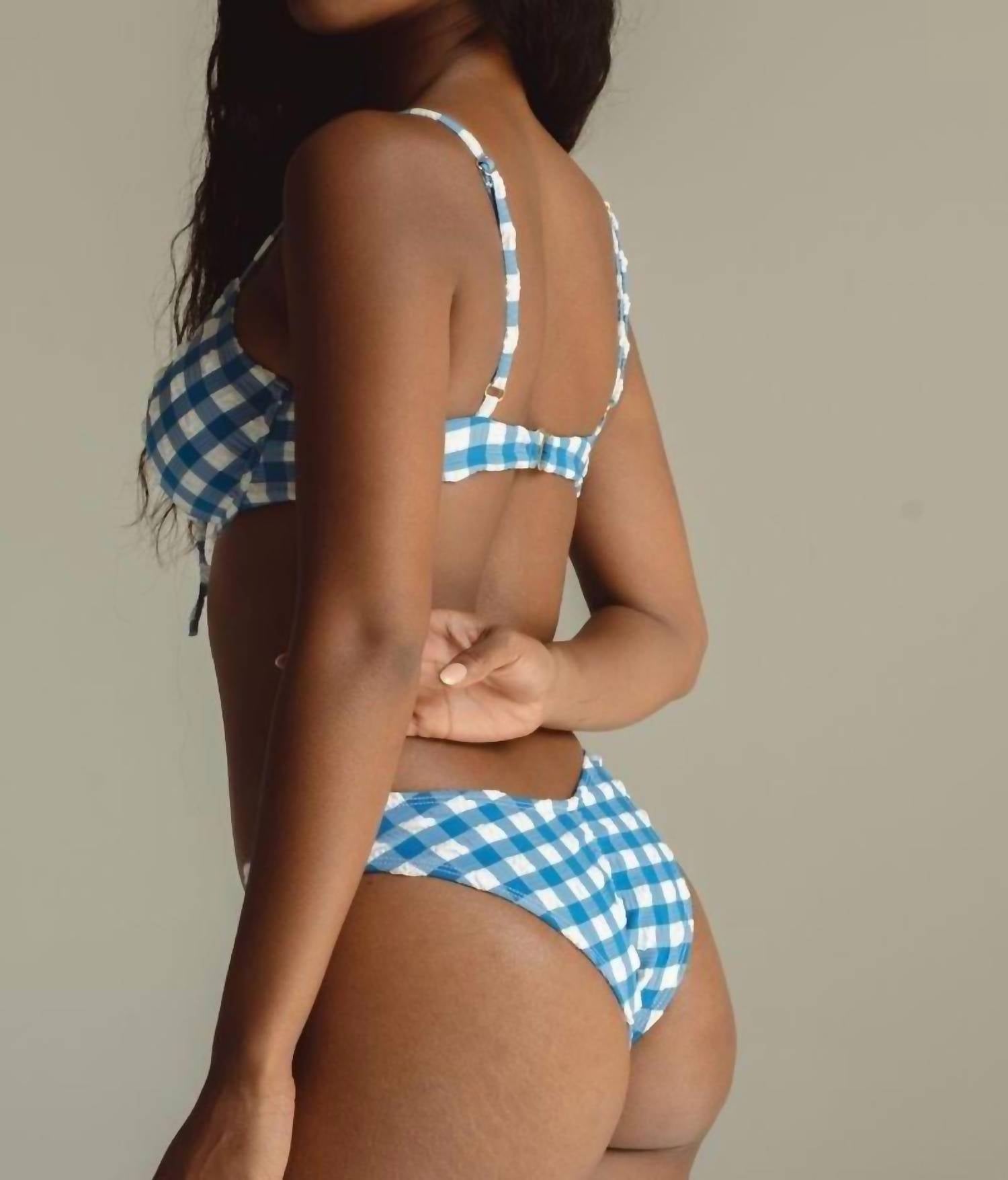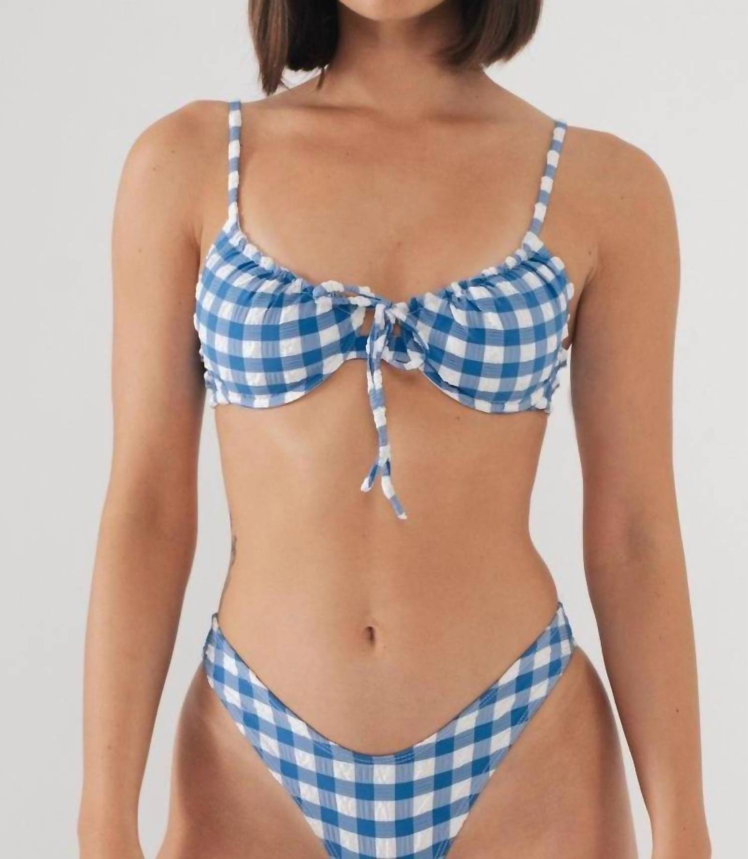 Elevate your beach day look with the Women's Lucy Bikini Top by Montce, a standout piece in Blue Gingham perfect for showcasing 90s fashion. Designed for medium to high support, it features a push-up top with a flattering scoop neckline, underwire, and demi cups. Adjustable shoulder straps and a back hook closure ensure a perfect fit, complemented by ruched trim detailing and a tie front with gold tarnish-resistant hardware. This polyester, nylon, and spandex blend, imported from Italy, offers a moderate stretch and should be hand washed for best care.