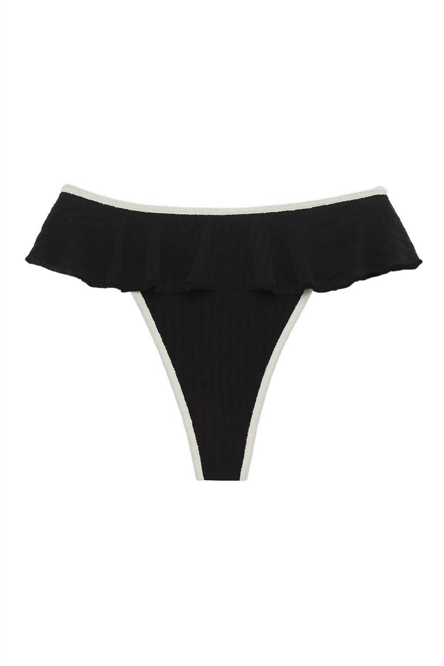 Ideal for relaxed poolside moments, this adorable swimsuit effortlessly transitions into the perfect sunset dinner outfit when paired with a flowing skirt. The Tamarindo Ruffle Bikini Bottom by Montce offers a stylish silhouette in a sleek Black Cream Binded Terry Rib color. This swim bottom features moderate back coverage, a medium rise, and a high-leg French cut to elongate the legs, complemented by a ruched back to accentuate the booty. Crafted from a delicate ribbed, terry cloth blend of nylon and spandex with Lycra lining, the fabric is imported from Spain. Care instructions include hand washing for maintaining its delicate structure.