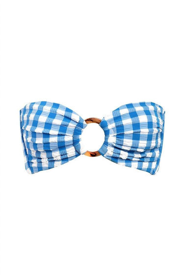 Discover the Women's Tori Ties Bandeau Bikini Top by Montce in a chic blue gingham pattern, perfect for your summer beach day. This strapless swim top offers medium support with side seam boning and features a bandeau silhouette with ruched detailing and faux tortoiseshell hardware for a stylish touch. Crafted from a puckered woven material with a blend of polyester, nylon, and spandex imported from Italy, it provides moderate stretch for comfort. Closure: Adjustable self-tie for a customized fit. Care: Hand wash only.