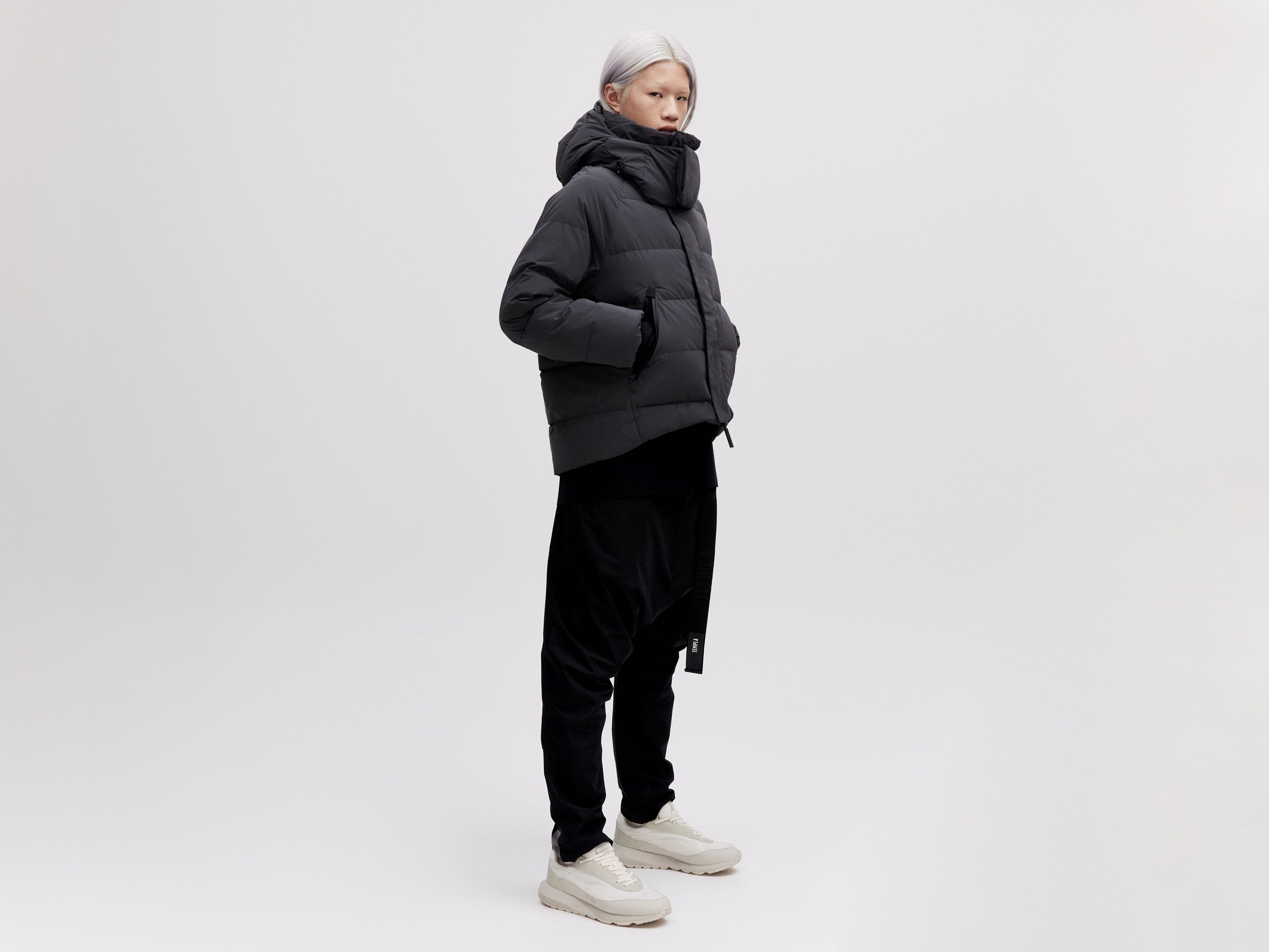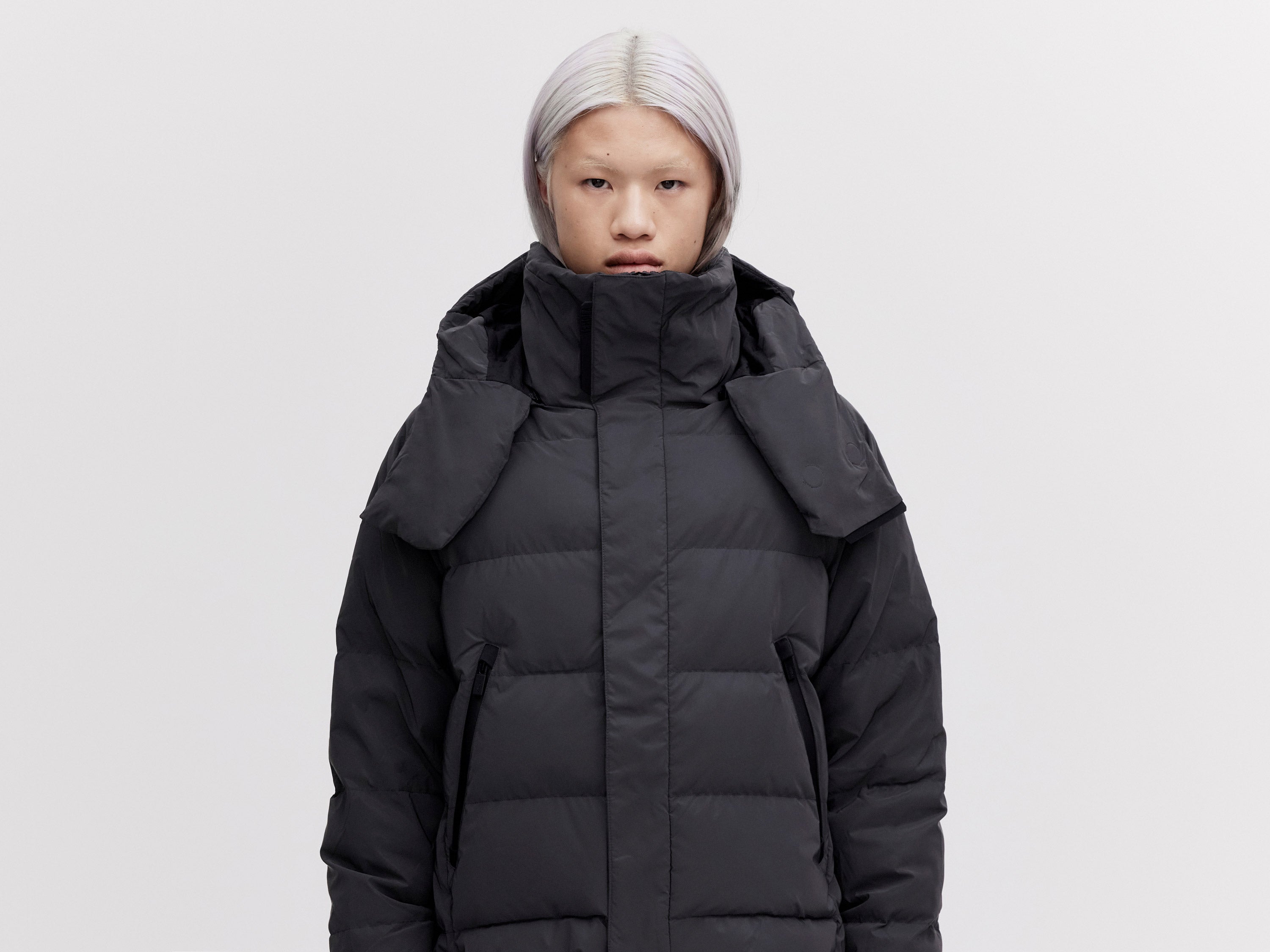 Our On/Off Hood O.S Down Jacket is made from a polyester canvas featuring a resin coating impregnated with thousands of micro-glass spheres creating a hyper-reflective surface appearance. With a classic relaxed fit, the adjustable waist straps and detachable hood with magnetic fastenings provide both practical and dynamic styling options.