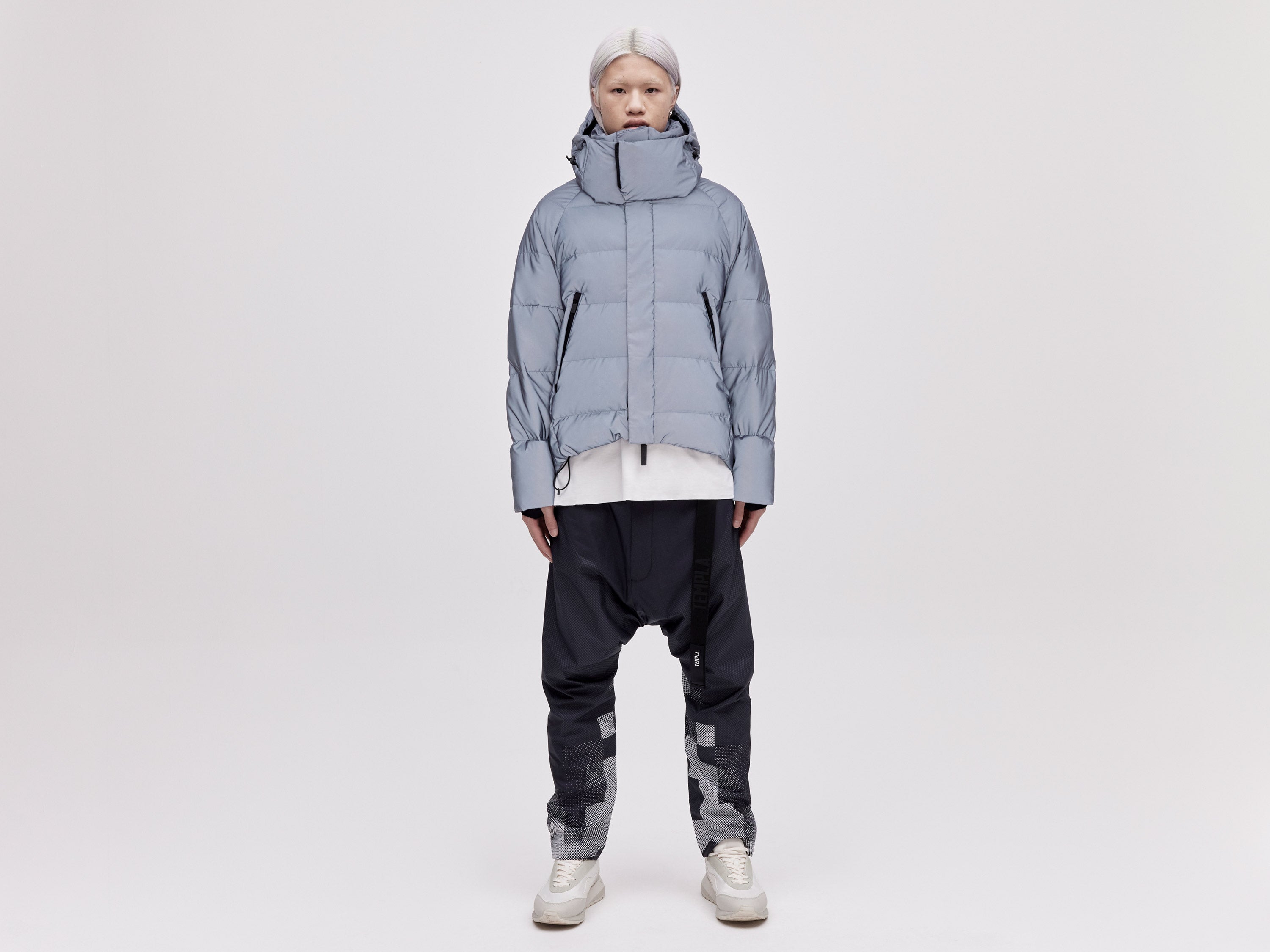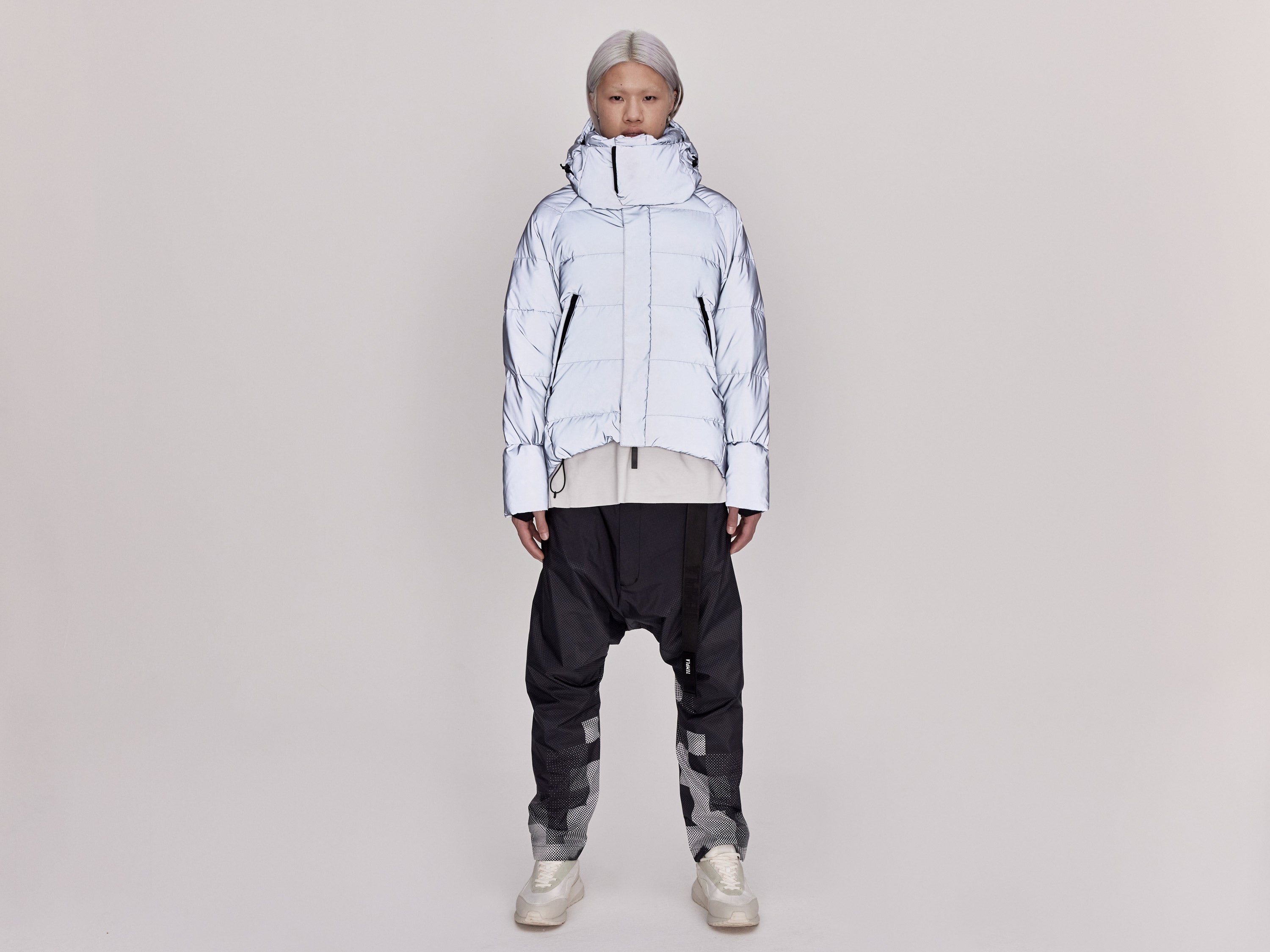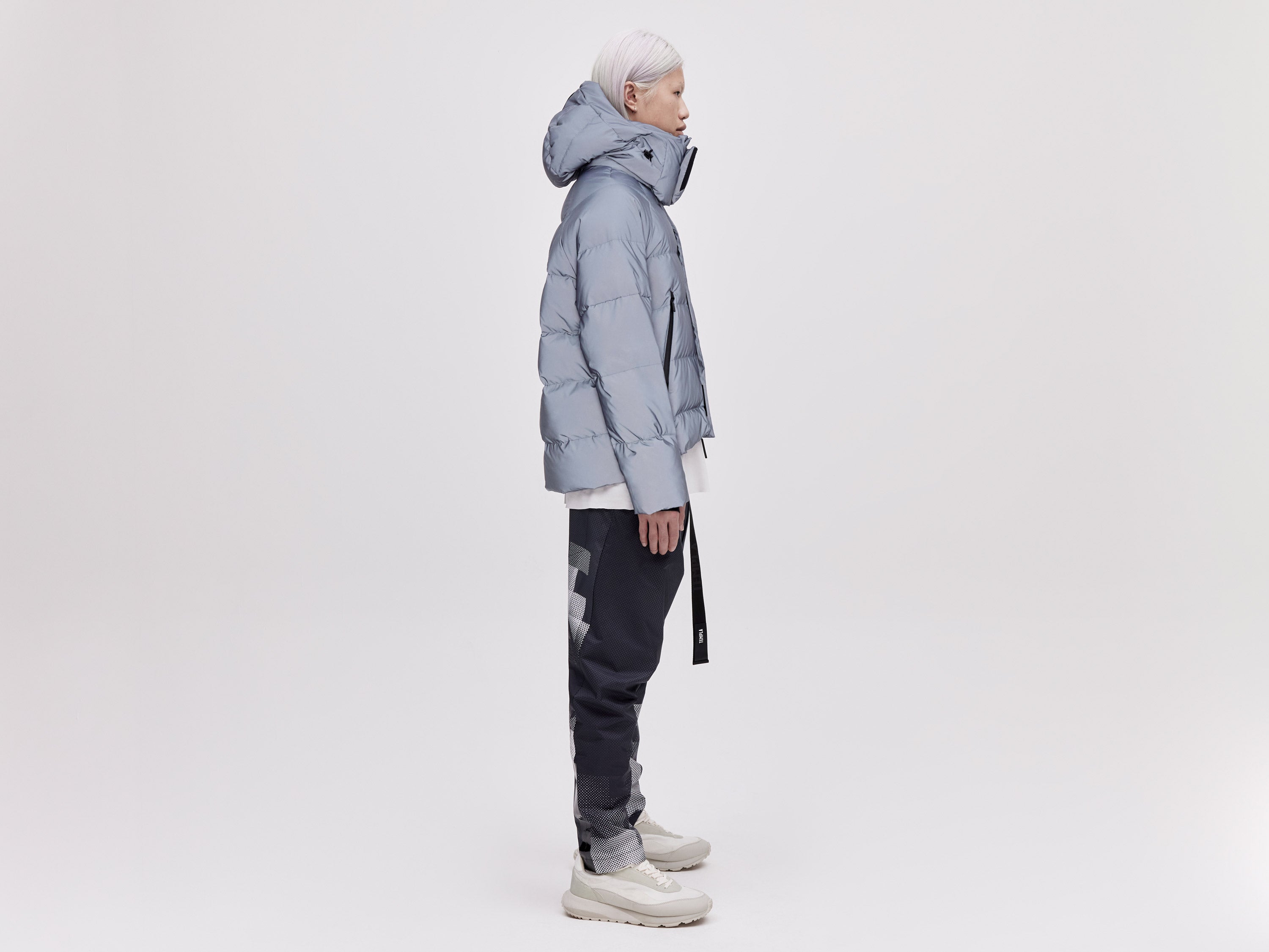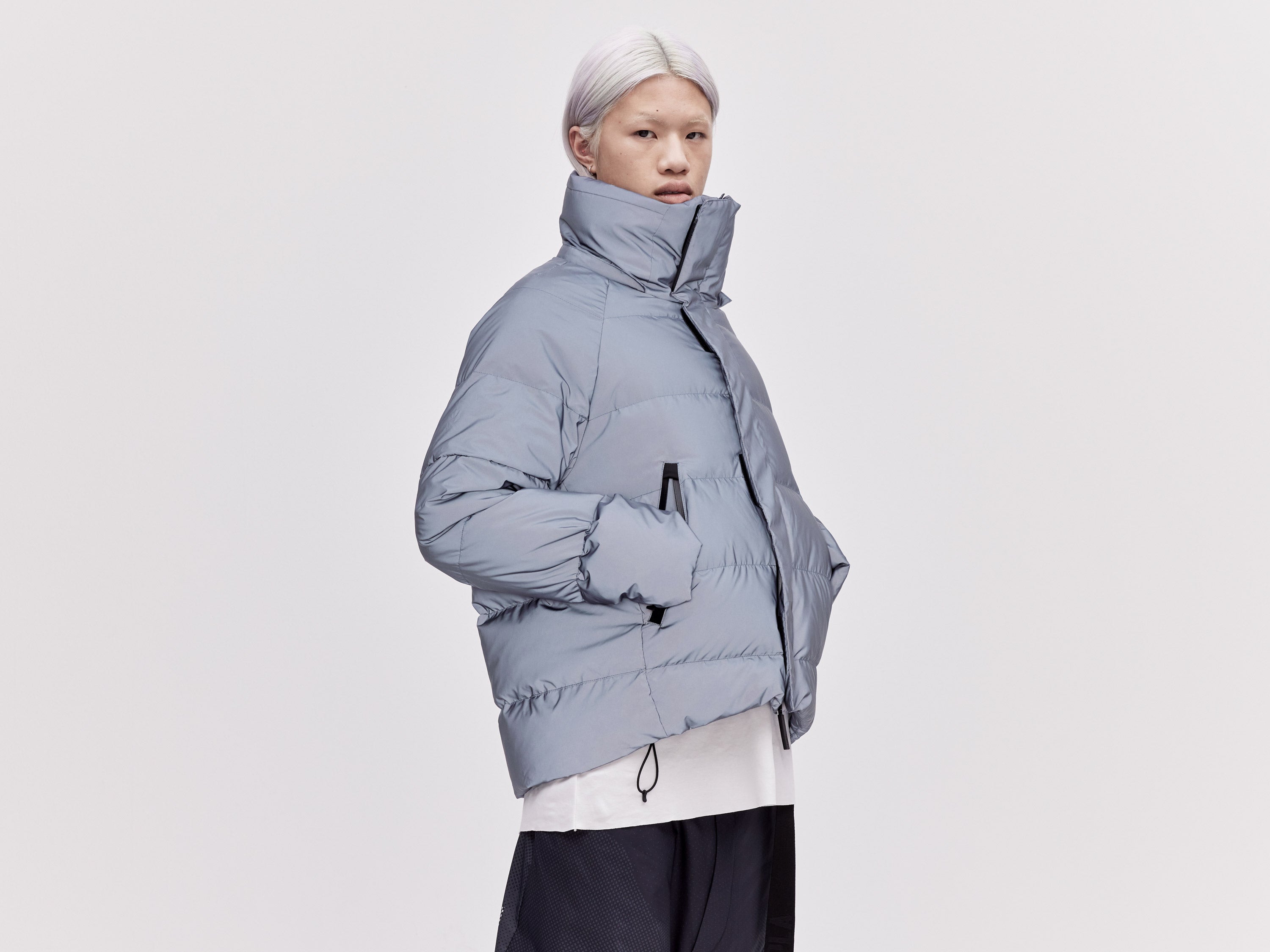 Our On/Off Hood O.S Down Jacket is made from a polyester canvas featuring a resin coating impregnated with thousands of micro-glass spheres creating a hyper-reflective surface appearance. With a classic relaxed fit, the adjustable waist straps and detachable hood with magnetic fastenings provide both practical and dynamic styling options.