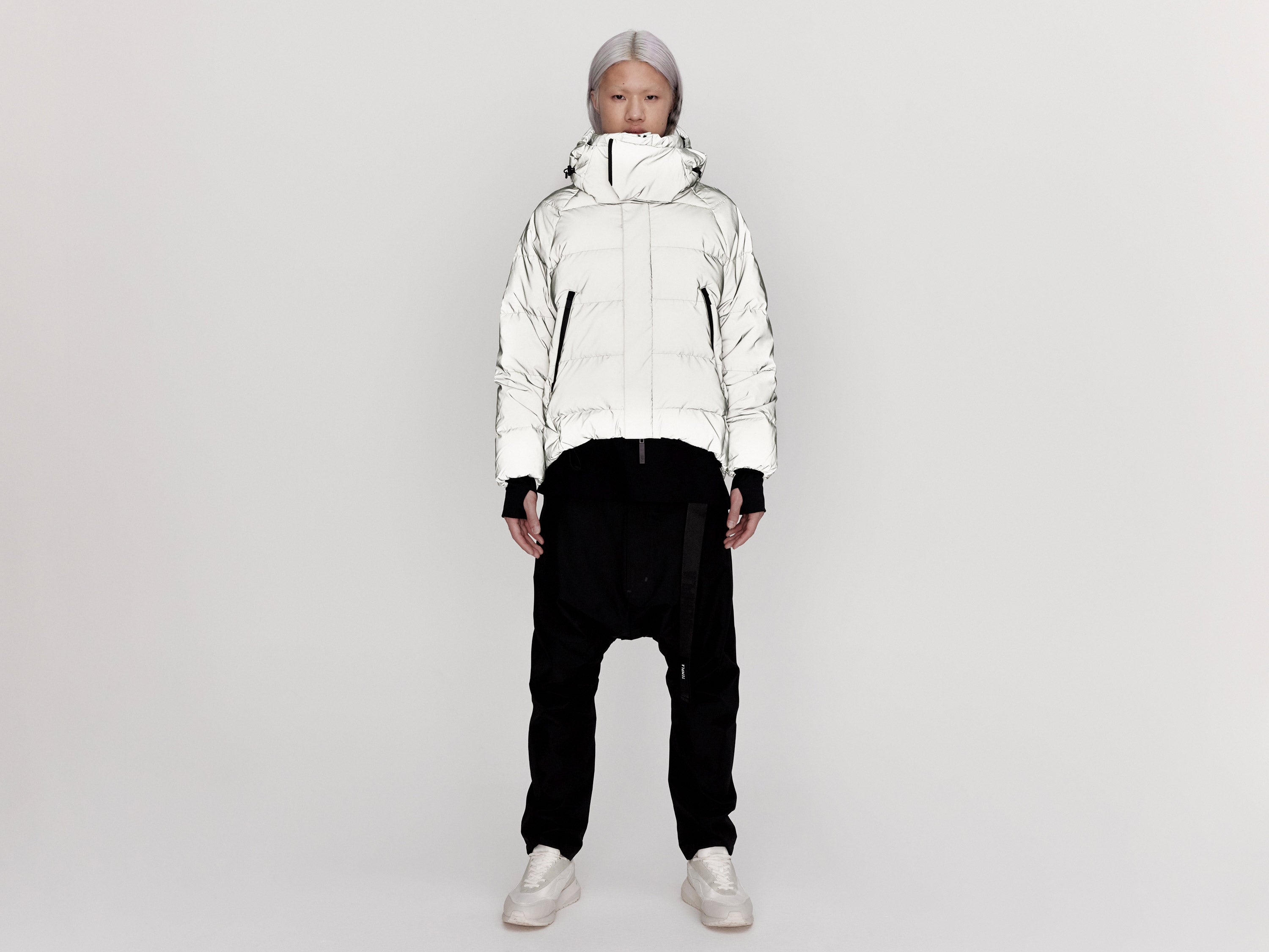 Our On/Off Hood O.S Down Jacket is made from a polyester canvas featuring a resin coating impregnated with thousands of micro-glass spheres creating a hyper-reflective surface appearance. With a classic relaxed fit, the adjustable waist straps and detachable hood with magnetic fastenings provide both practical and dynamic styling options.