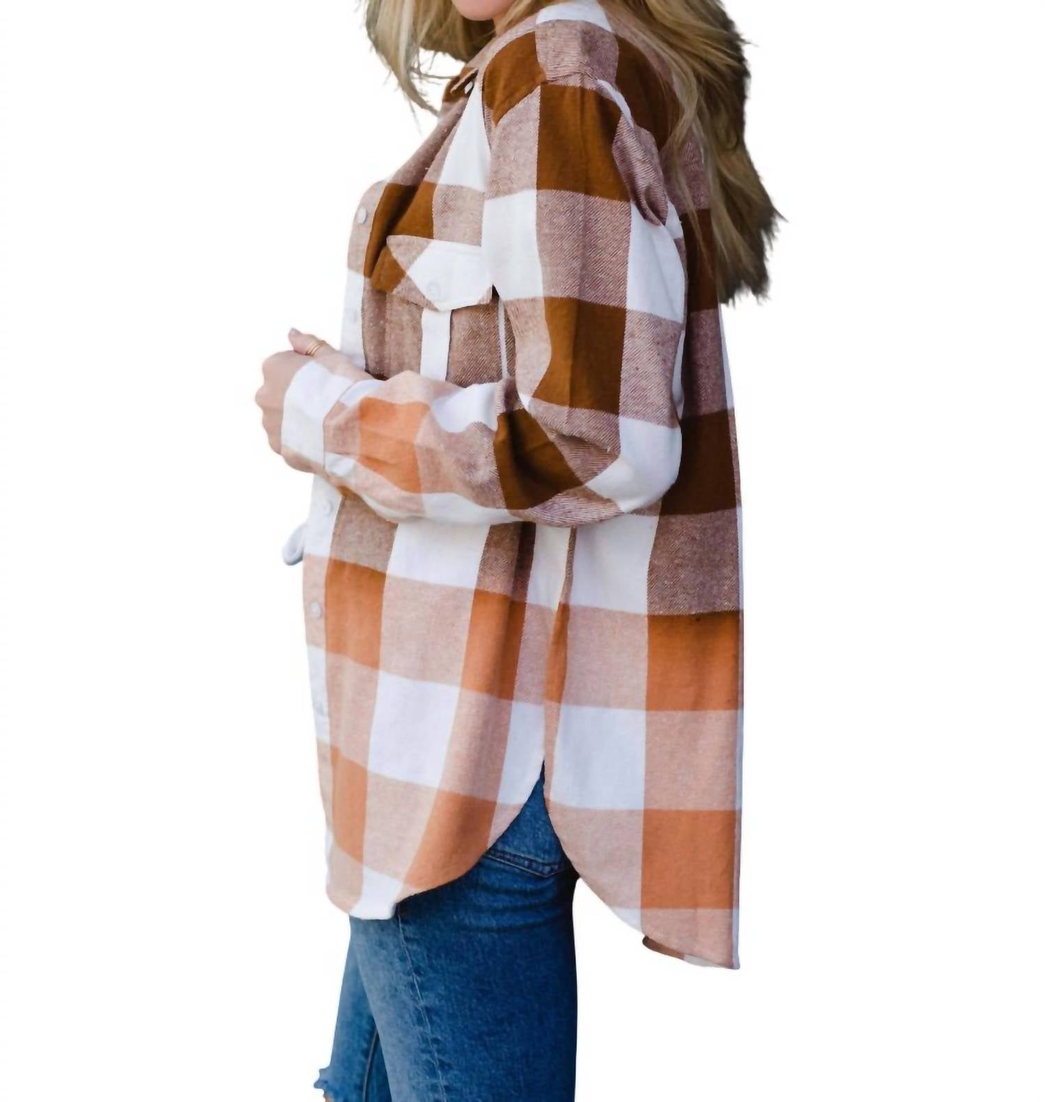 Elevate your wardrobe with the Bleached Gradient Cotton Plaid Flannel Shacket by Panache Apparel. Crafted from 100% cotton, this long sleeve shacket features a brown and ivory plaid pattern with a unique bleached dipped contrast. Designed with functionality in mind, it includes practical pockets and a classic collar. Enjoy the ease of its button closure, making it an ideal addition to your collection of button down shirts.