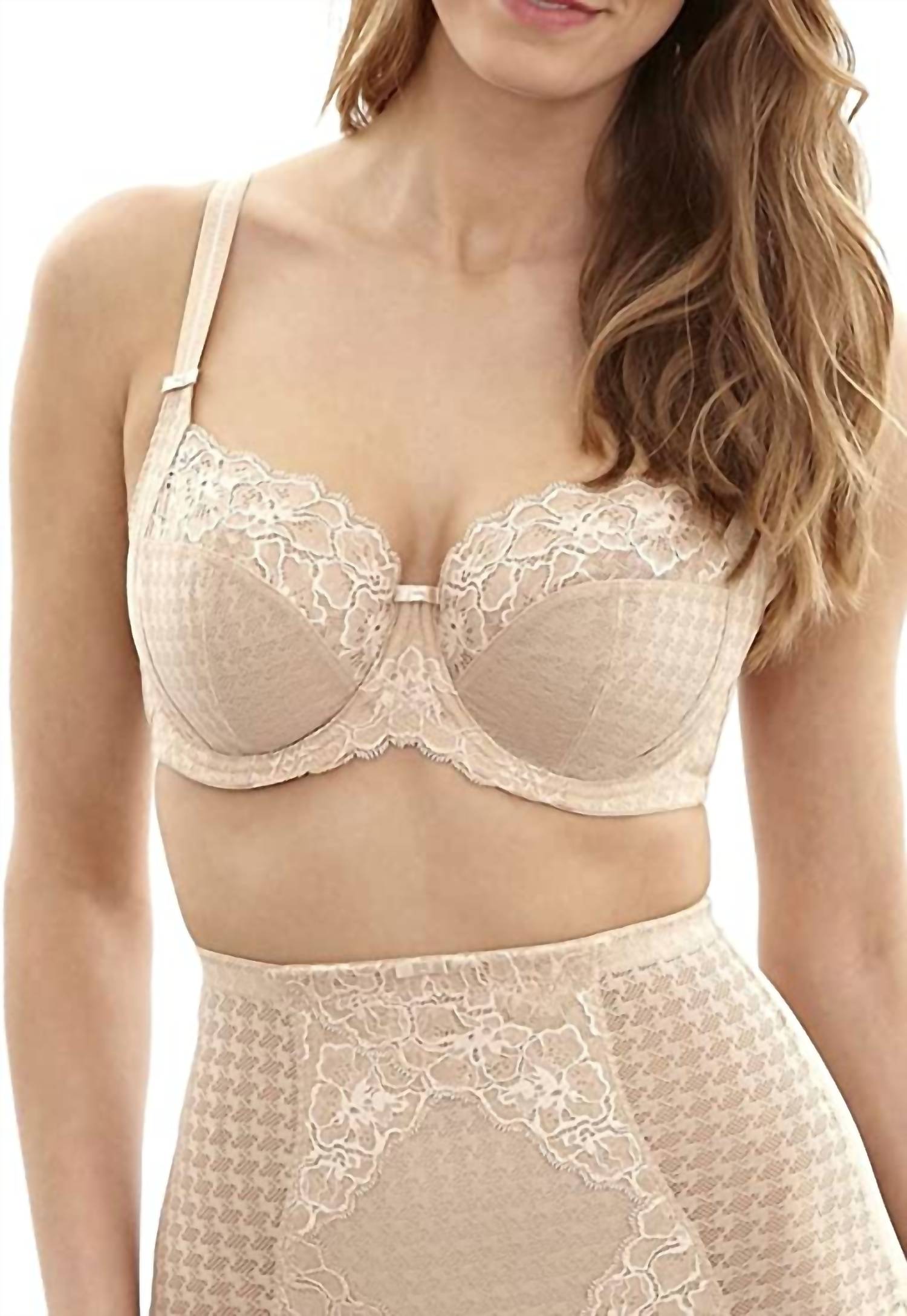 Discover the Women's Envy Balconnet Bra by Panache in a sophisticated chai hue, designed to enhance elegance and comfort. Crafted from 88% polyamide and 12% elastane, this imported bra promises durability and softness. Featuring a hook and eye closure, it boasts structured four-section cups adorned with classic hound tooth jacquard and stretch floral lace. This underwire bra provides unrivaled support with its Powermesh wings and strong underband elastic, making it a perfect addition to your spring wardrobe. Care: Hand wash only.