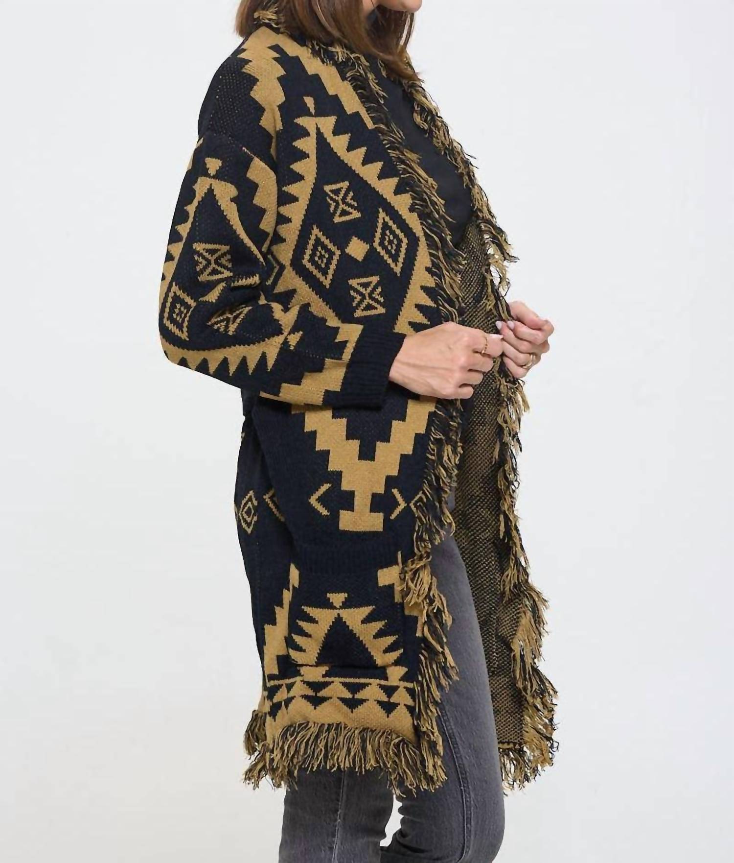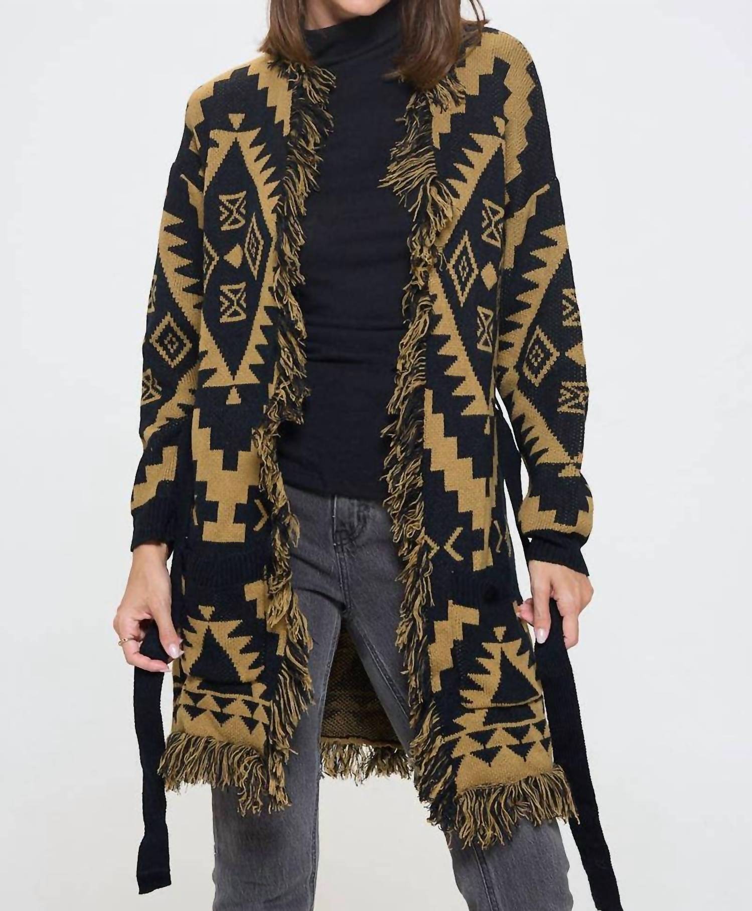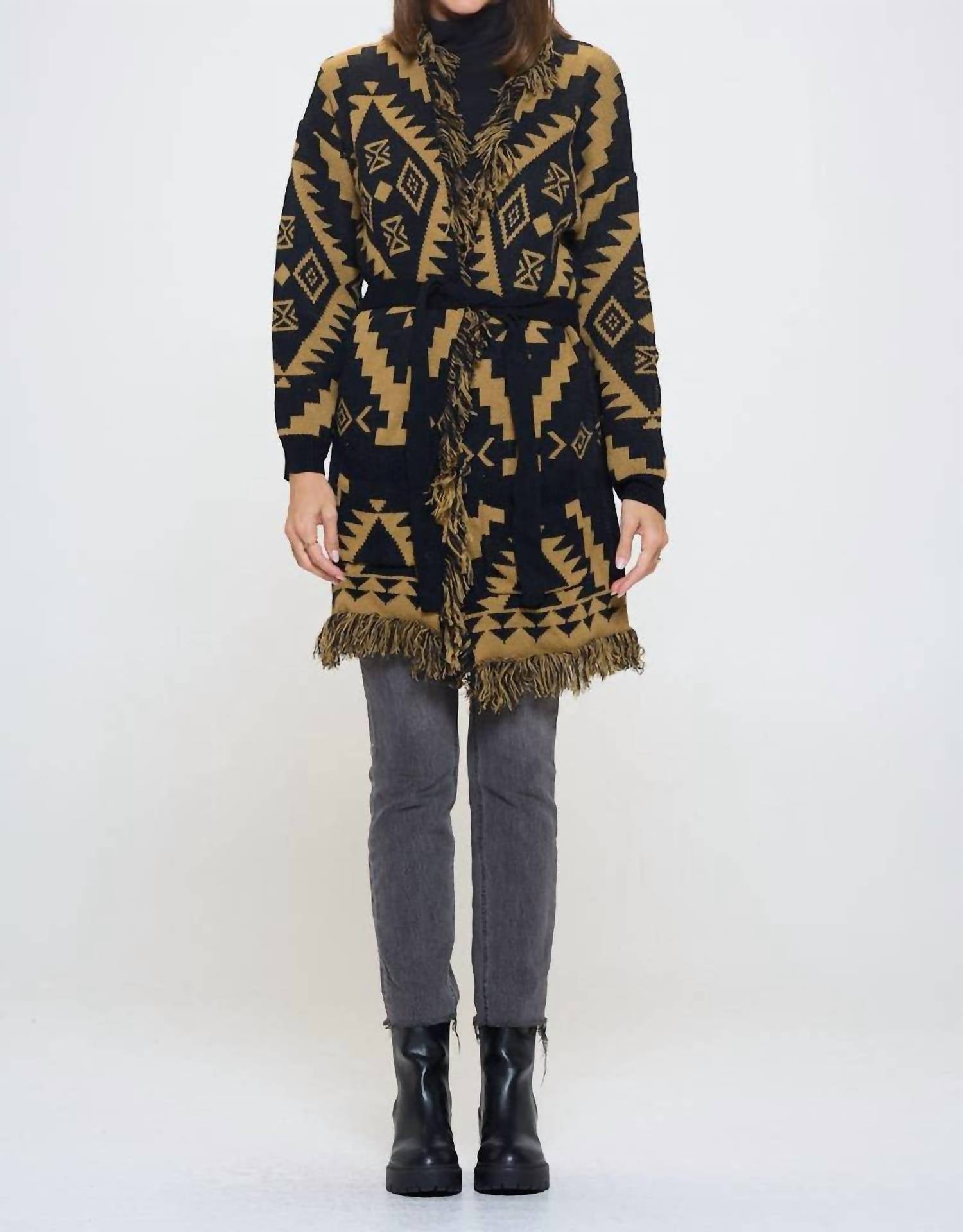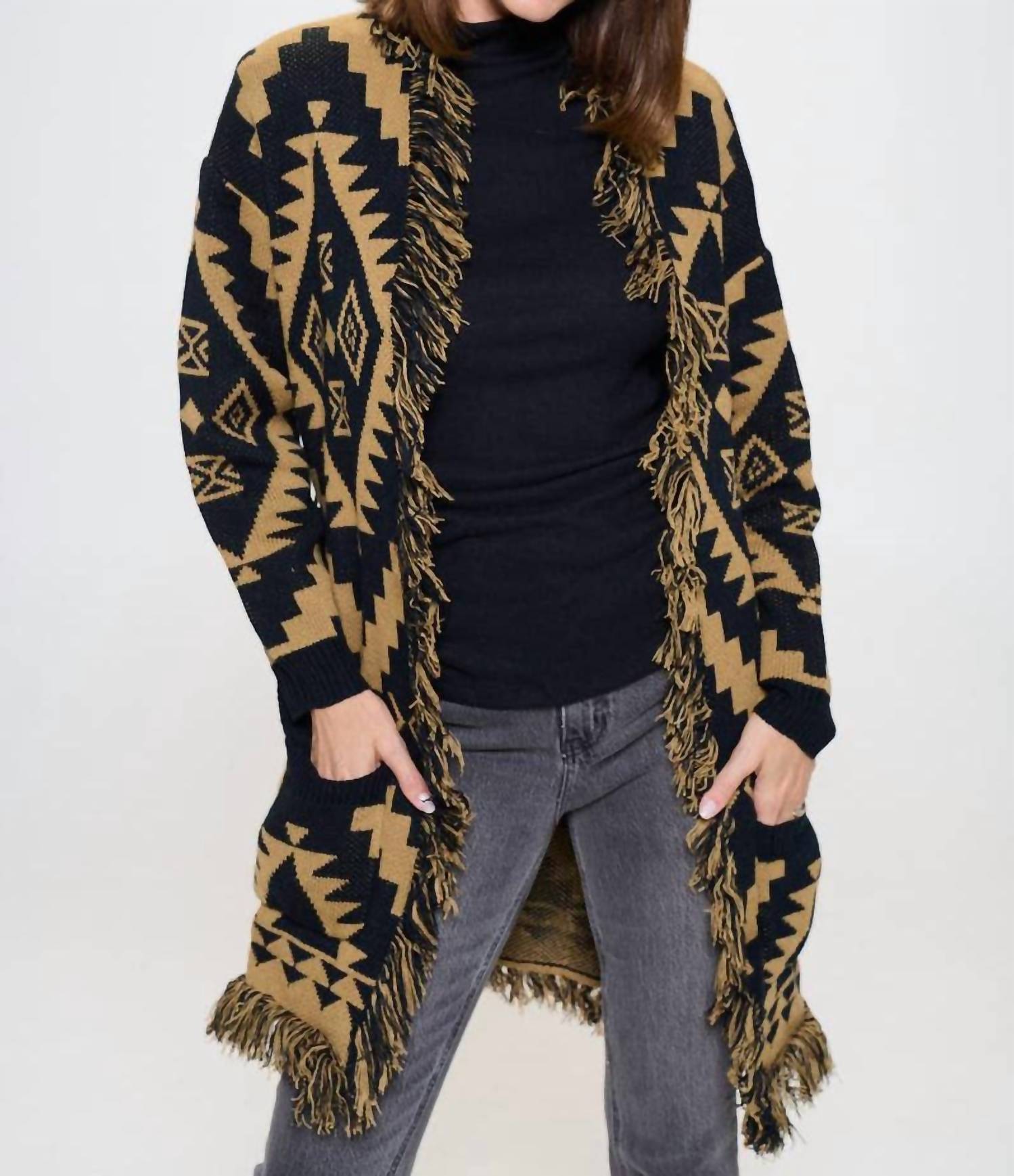 Elevate your fall and winter wardrobe with the Renee C. Tribal Print Cardigan, a standout piece in taupe and black. This long sleeve cardigan, made from 100% Acrylic, features stylish fringe detailing and tie closure for a unique twist. Proudly crafted in the USA, it's perfect for adding a dash of tribal flair to any ensemble. Available in plus sizes, it offers practicality with easy machine wash care and includes convenient pockets for versatile wear. Available dimensions: Bust 18-24", Length 36-39".