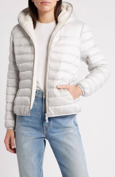 Stay warm and stylish with the Women's Elvira Quilted Hooded Puffer Jacket by SAVE THE DUCK, perfect for your next camping adventure. This solid white puffer features long sleeves and a convenient hooded neckline, keeping you cozy during the winter season. It includes practical zip closure and pockets, ensuring functionality without sacrificing style. This minimalist, lined jacket is water-repellent, offering added protection against the elements.