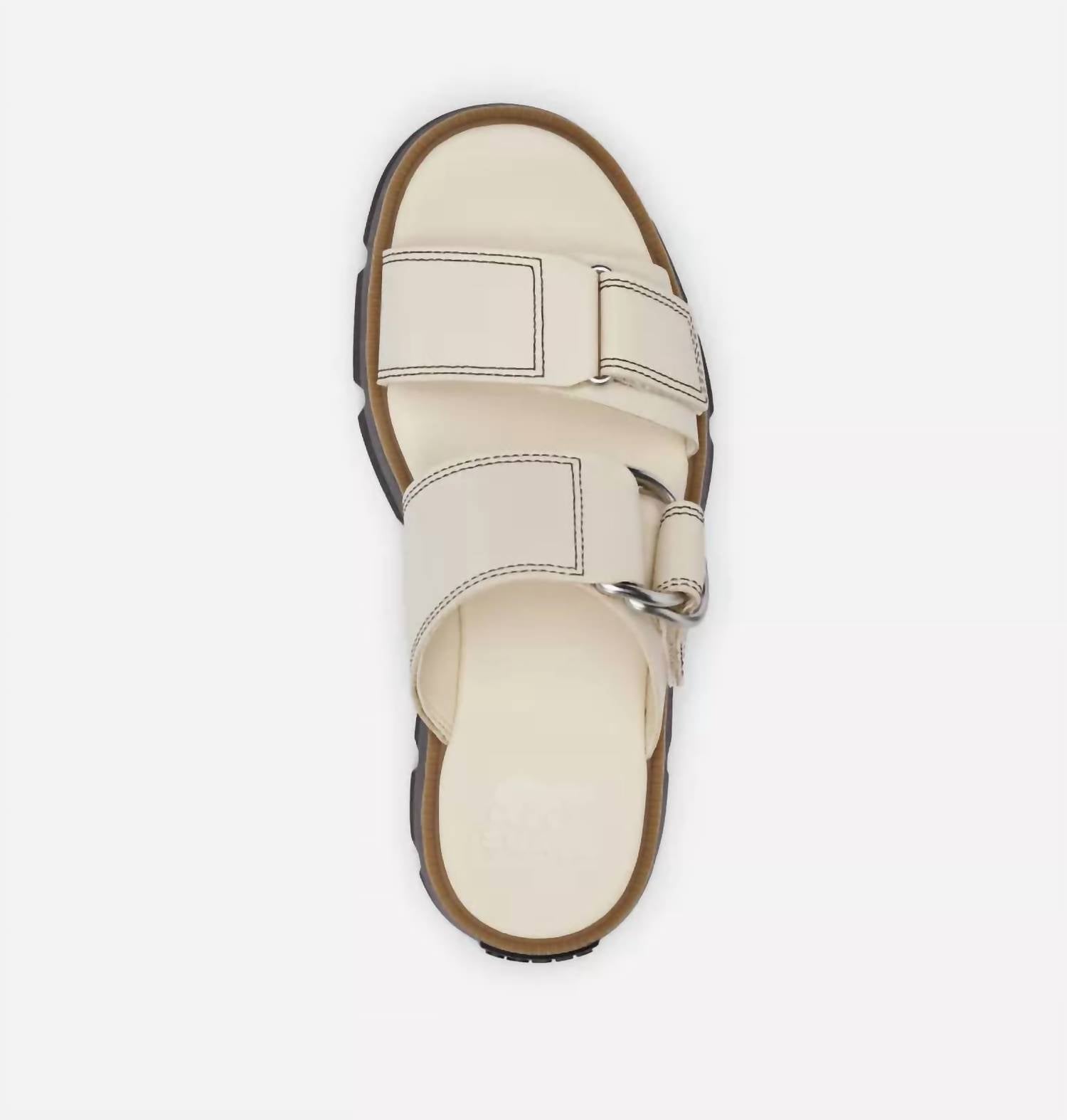 Step into summer with the Women's Rein Slide Sandal by SOREL, a minimalist vacation essential designed for effortless style. These chalk/black sandals feature adjustable leather straps and sleek hardware, complemented by a 1.5-inch chunky heel for a comfortable lift. The open toe design is supported by EVA foam footbeds and FEATHERTREAD rubber soles, ideal for casual outings or beach days. Embrace all-day comfort and chic versatility with this perfect warm-weather companion.