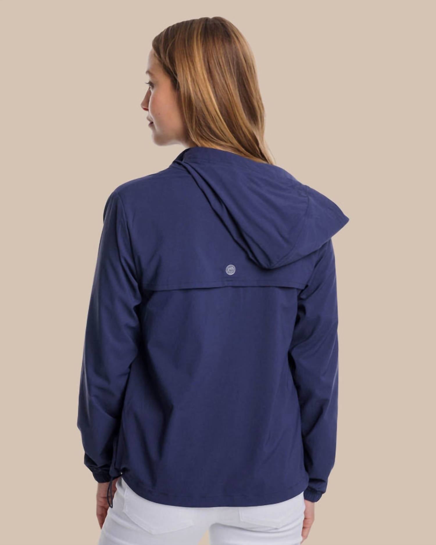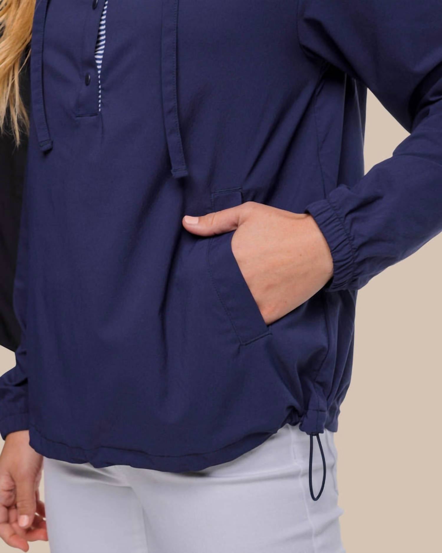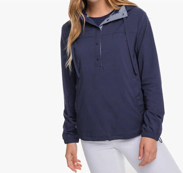 Introducing the Southern Tide Calie Pop Placket Popover, a versatile women's casual jacket in Dress Blue perfect for spring getaways. This solid pattern design features long set-in sleeves and a drawstring hood, ensuring comfort and style. Made from a 92% nylon and 8% spandex blend, it's both stretchy and equipped for UV protection. The hidden snap closure, lined interior, and welt hand pockets make it functional, while its quick-dry, wicking properties mean it's ideal for breezy days. Care: Machine wash.