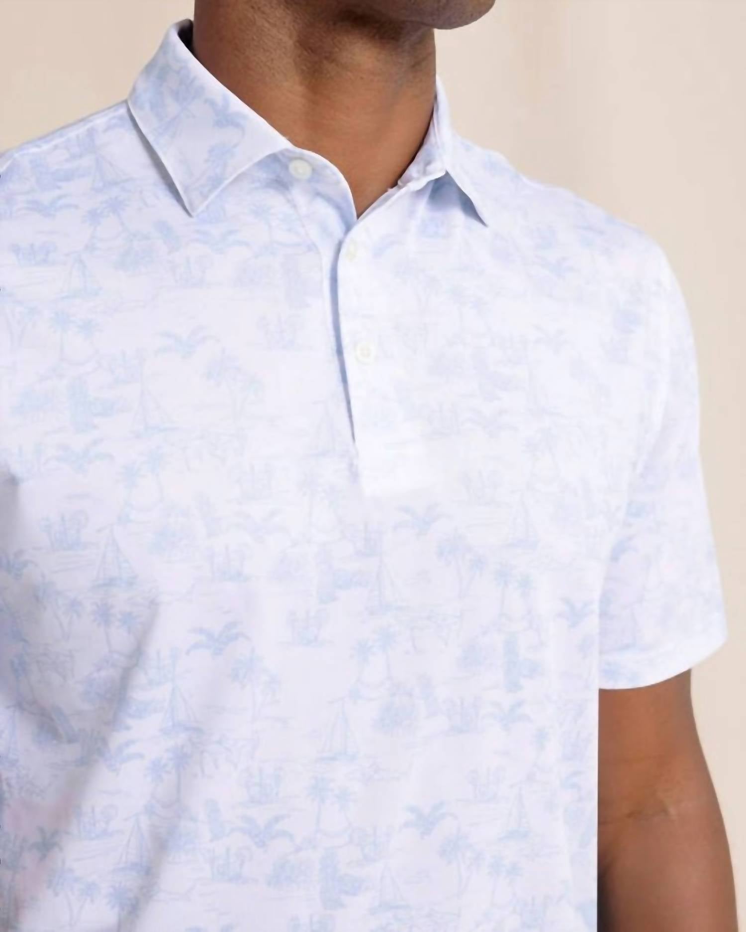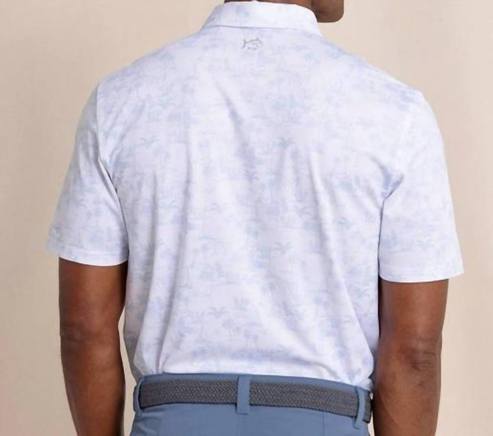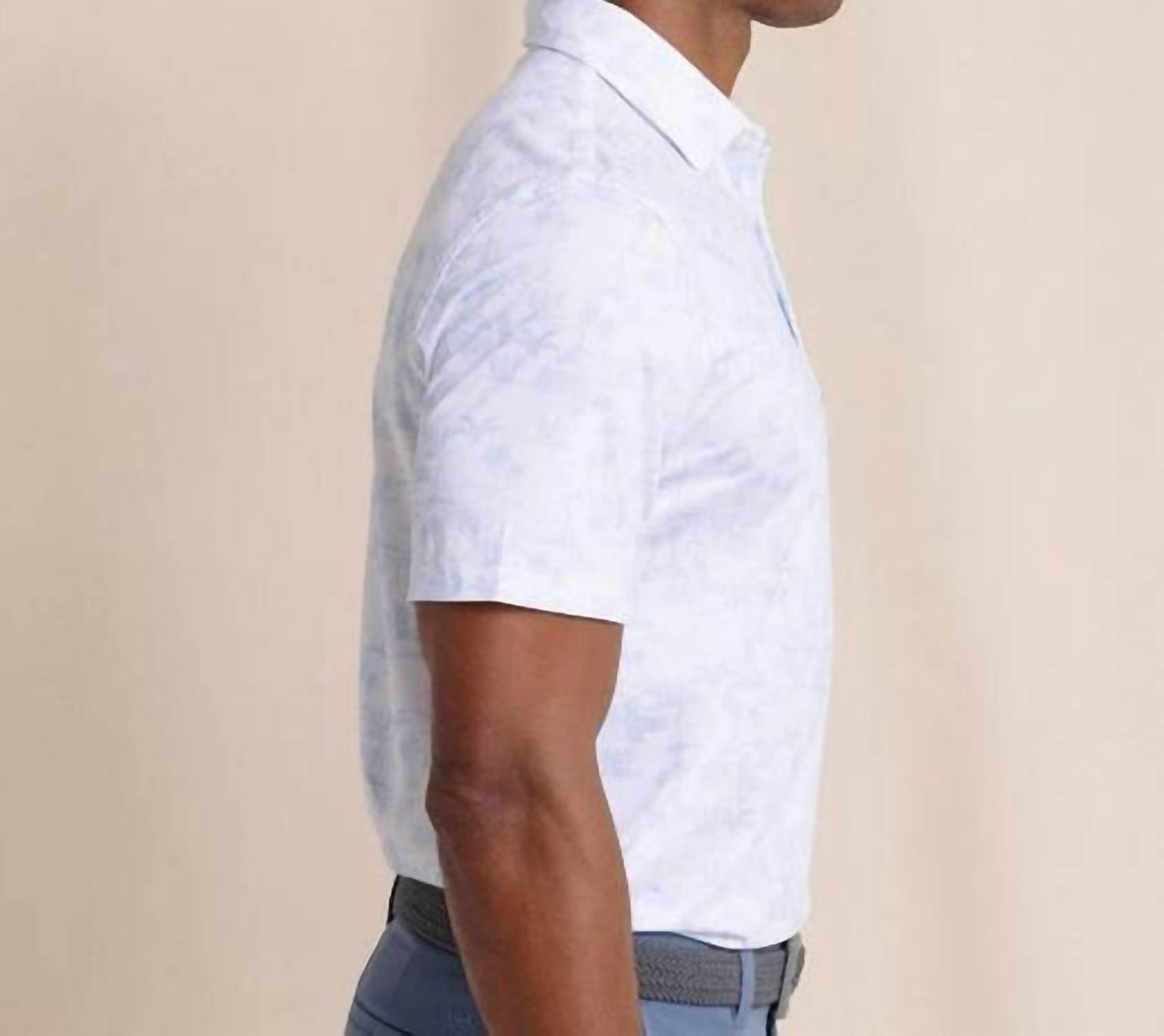 Enhance your wardrobe with our patterned polo shirt, which features a subtle tropical style. It has a self-collar, a three-button placket, and internal collar stays, all of which contribute to a classic polo look. Made from premium performance materials, this shirt keeps you breathable and comfortable from day to dusk.
