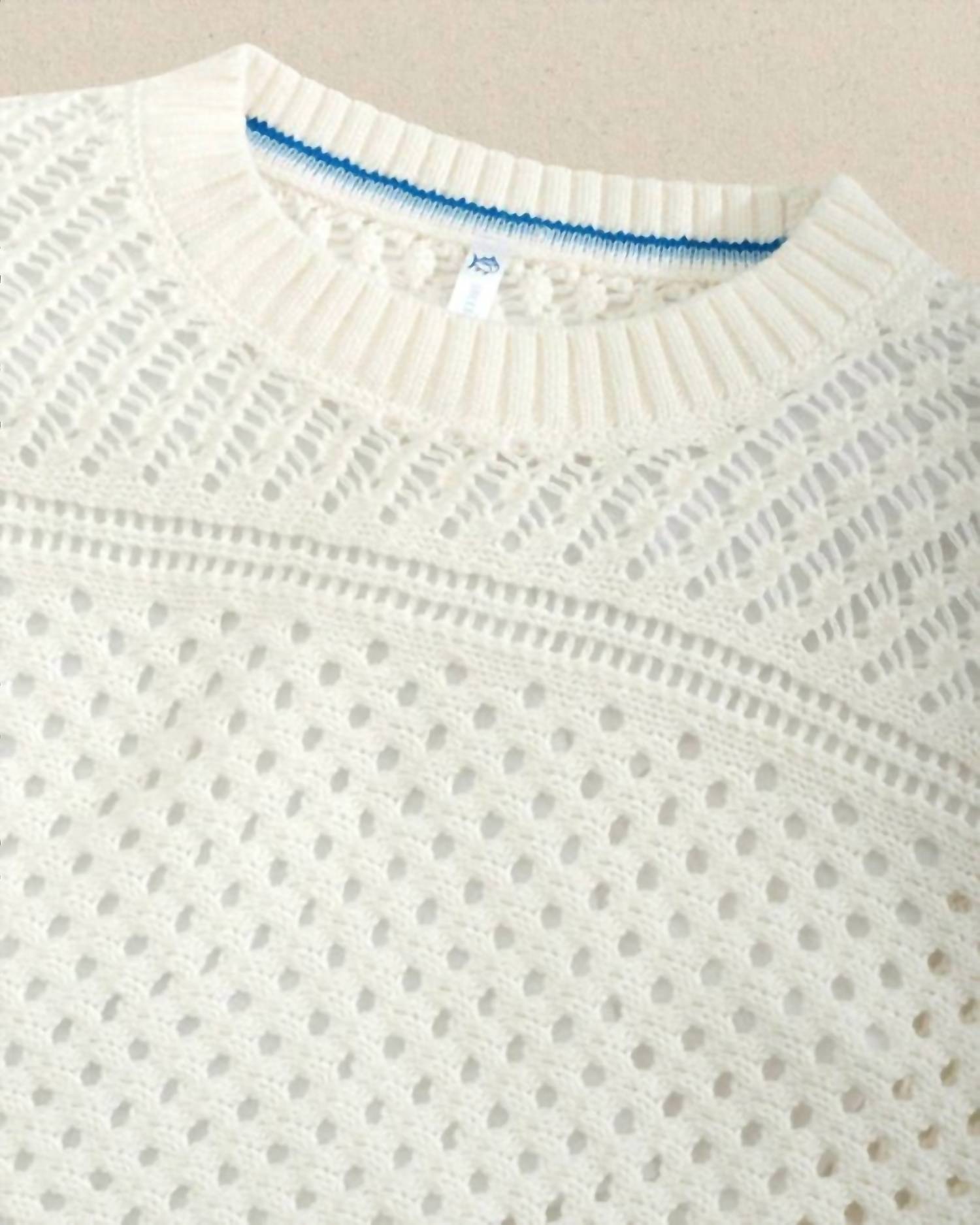 This woman's sweater is a beautifully designed piece that combines airy elegance with effortless style. Perfect for those transitional days, this sweater offers a sophisticated take on layering. Open Stitch. Rib at neck, cuffs, and hem. Machine Wash.