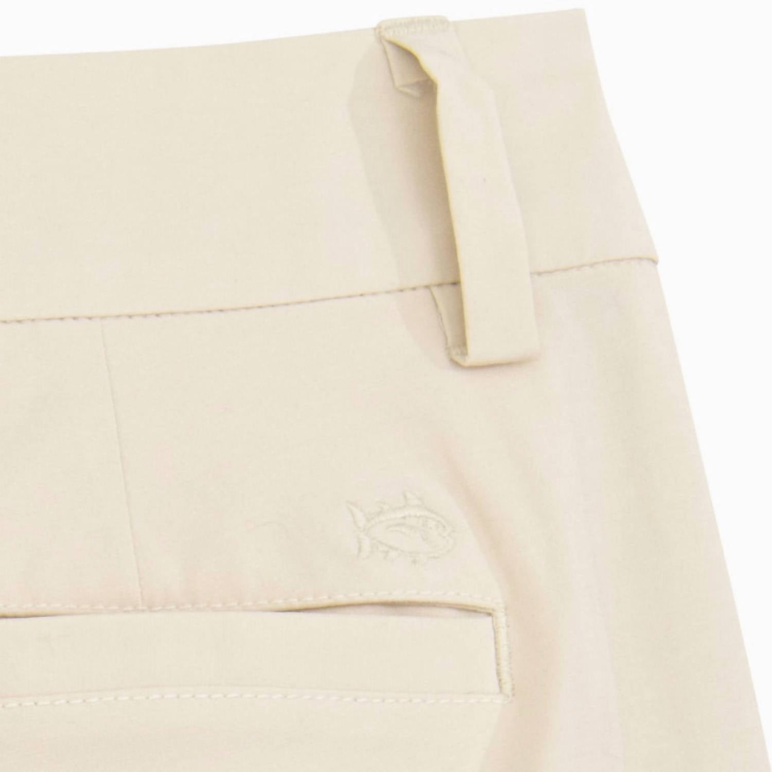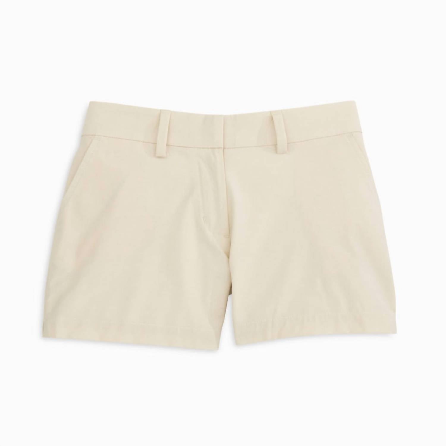 Elevate your summer wardrobe with the Southern Tide Women's Inlet 4" Short in a chic stone color. Designed for vacation and casual wear, these high-waisted shorts are crafted from a nylon blend featuring stretch fabric for ease of movement. With a stylish 4-inch inseam, they provide comfort and practicality with slanted side pockets, a welt pocket at the back, and a hidden button closure with an exterior hook and bar and coil zip fly. The shorts boast moisture-wicking technology, UPF 50 protection, and thoughtful details like side slits and embroidery. Care is simple with machine wash.