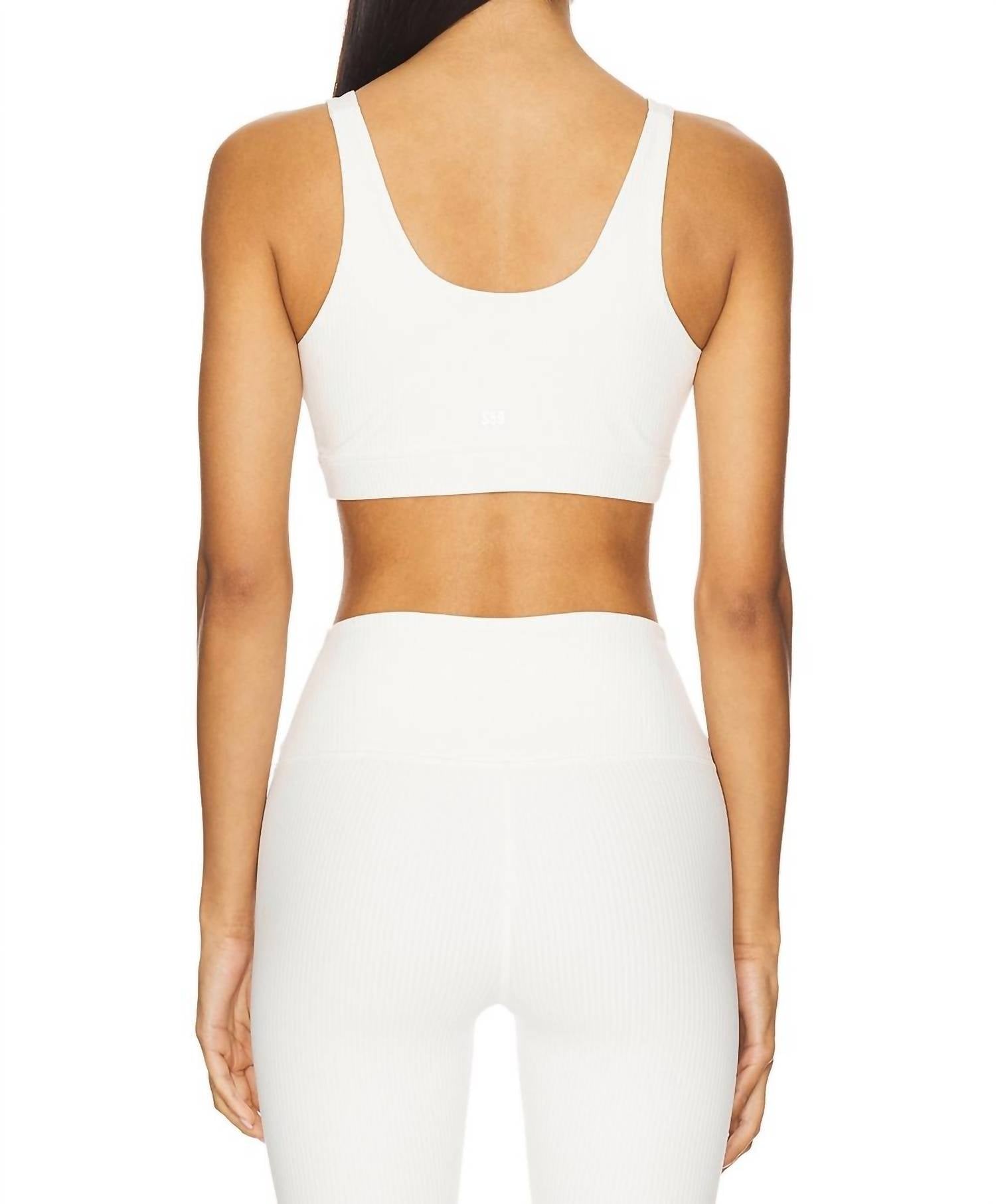 The most comfortable and supportive sports bra you'll own. Elevate your summer workout outfits with the Airweight Rib Bra by SPLITS59, crafted from a lightweight ribbed activewear fabric in solid white. Designed for hot yoga, barre, and Pilates, this bra features a supportive silhouette with a scoop neckline and unpadded cups, providing comfort and style. Composition: 81% Nylon, 19% Spandex. Country of Origin: China. Closure: Pull-on styling. Care: Machine wash. Length for size S: 12.25 inches.