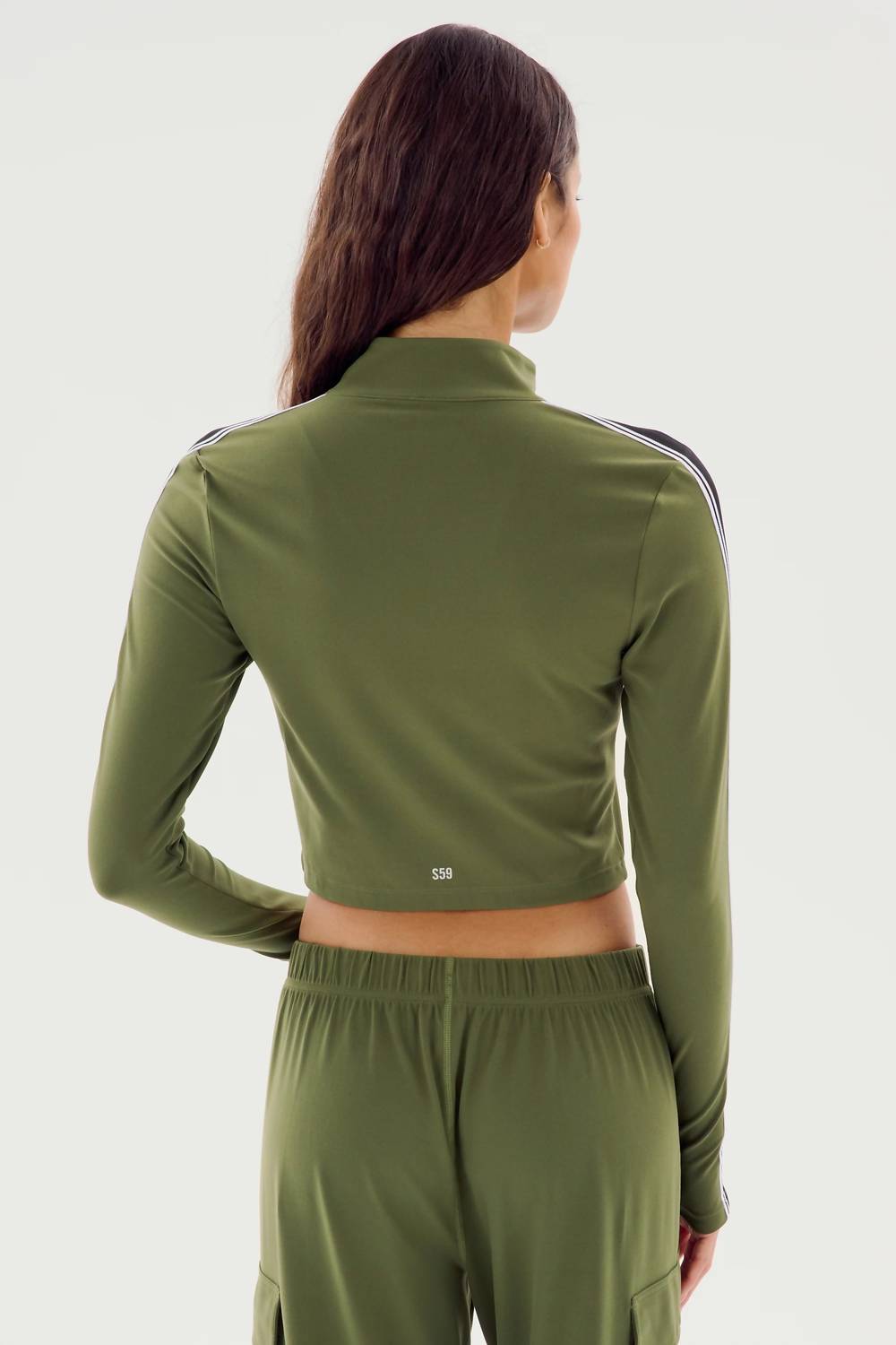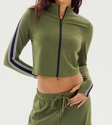 Experience the ultimate in sleek style with the Leo Airweight Jacket Crop by SPLITS59, designed to accentuate your athletic look in a stunning olive hue. This women's piece boasts long sleeves and a mockneck for a modern aesthetic, while the side zipper closure ensures a snug fit. Its buttery soft material and cropped length make it perfect for both solo wear and layering over your favorite matching Airweight pieces. Embrace aerodynamic lines in solid olive, featuring a cleaned-lined finish without additional pockets for a streamlined silhouette.