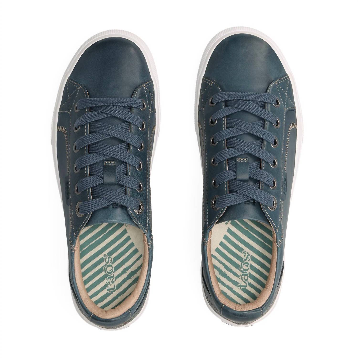 When fashion and function come together seamlessly. Step into comfort and style with the Women's Taos Plim Soul Lux Leather Sneaker in Petrol Blue. These sneakers feature a premium soft leather upper with a padded collar, ensuring a snug and comfortable fit. Designed with a molded, contoured insole and flexible rubber outsole, they offer excellent arch and metatarsal support, along with forefoot cushioning, making them orthotic friendly. Ideal for Spring travel and minimalist trends, these flat heel sneakers boast a 1 1/8" heel height, perfect for both casual wear and New Year's Eve festivities.