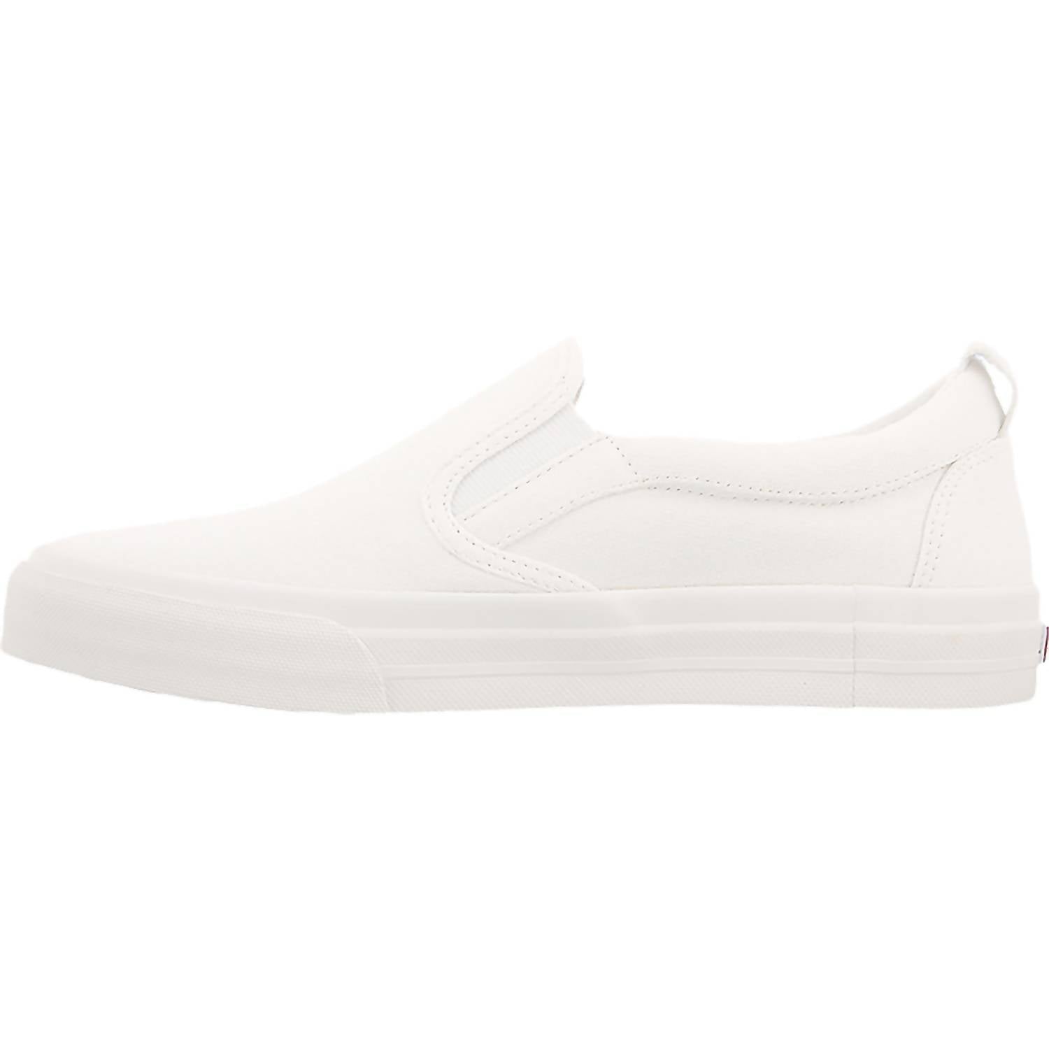 Step into comfort with the Taos Women's Rubber Soul Canvas Sneaker, a minimalist sneaker perfect for summer travels. These white canvas slip-ons feature elastic goring for a snug fit and come with arch and metatarsal support for all-day wearability. The shoe is crafted with a thick, high platform, a molded contoured insole lined with canvas, and polyurethane for superior cushioning. Its durable rubber outsole provides excellent flexibility, and the 1" flat heel ensures a comfortable stride. For optimal fit, consider sizing up by half a size.