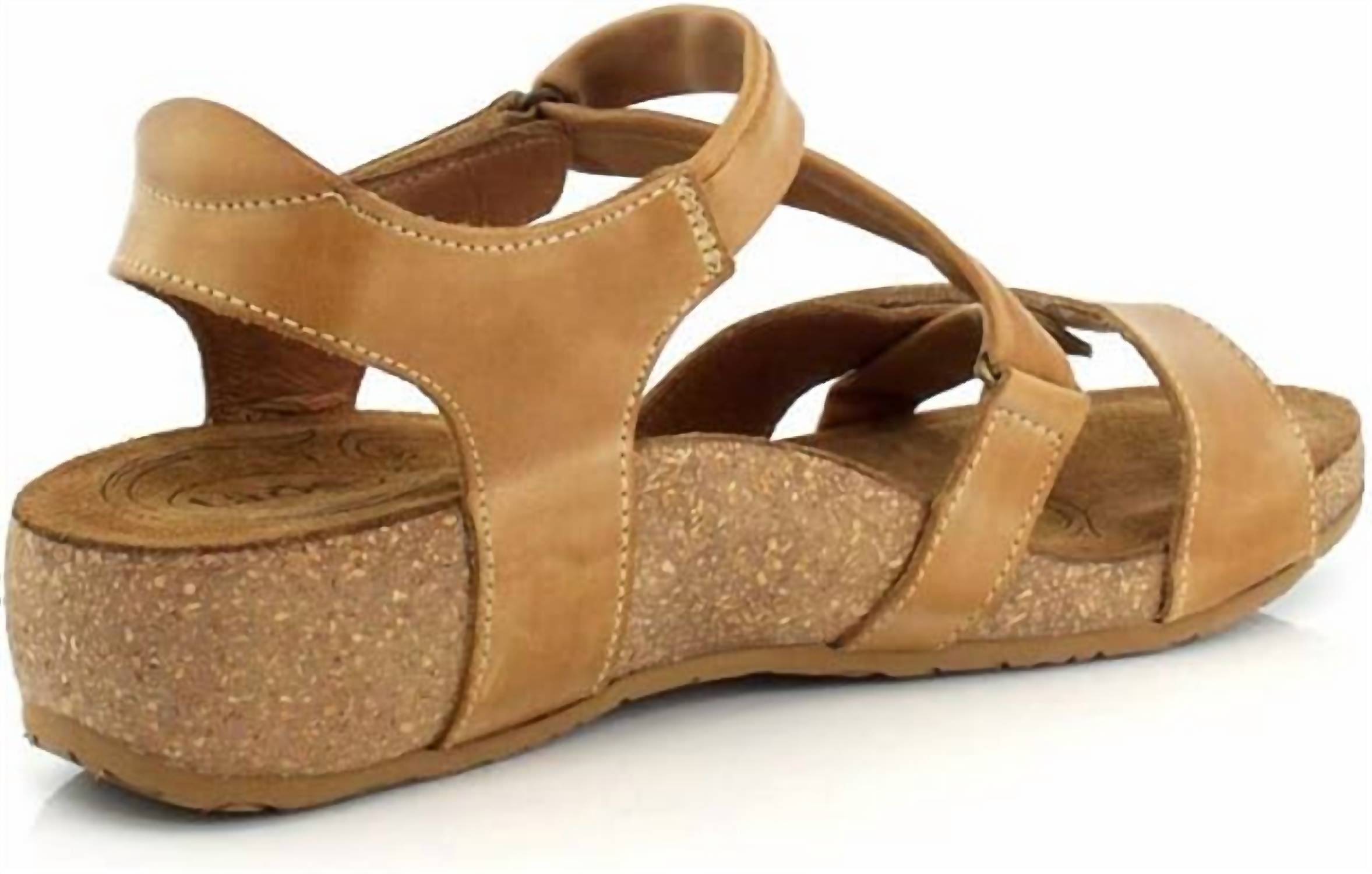 Discover the stylish and comfortable Women's Universe Wedge Heel Sandals by Taos, perfect for vacation or summer outings. Crafted from camel leather, these sandals feature a Z-strap design and a lightweight, padded contoured cork footbed, offering exceptional arch and metatarsal support. With a 1.75" wedge heel and flexible rubber outsole, they provide a sophisticated vintage flair through soft, rich leather and crafted medallion embellishments. Closure is via adjustable hook and loop straps for a personalized fit.