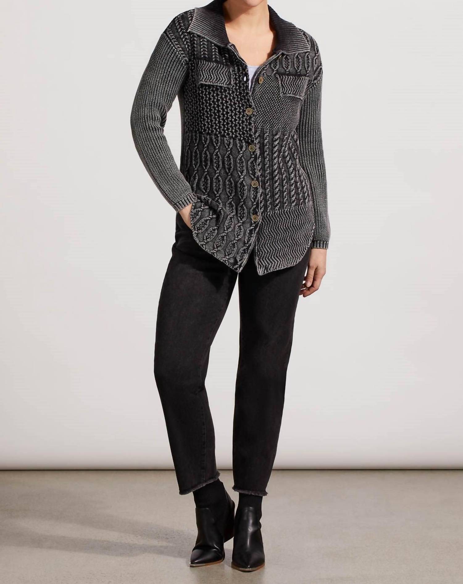 Introducing the Button Up Patchwork Shacket by TRIBAL, a stylish and versatile addition to your wardrobe. This black utility jacket features long sleeves with drop shoulders and a relaxed fit, offering a laid-back yet put-together look. Made from 100% sustainable BCI cotton, it features a multi-stitch patchwork design and contrast horn buttons that enhance its textured appearance. Closure: Button closure. Care: Machine wash. Perfect for fall and Thanksgiving occasions.