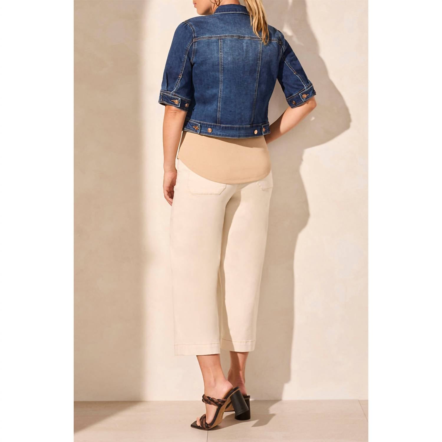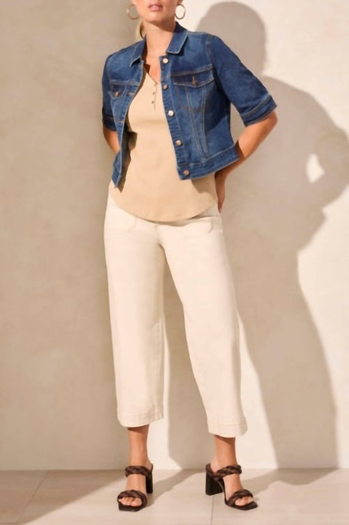 Throw this adorable jacket over just about anything for an effortlessly stylish look. Introducing the Comfort Stretch Elbow Sleeve Denim Jacket by TRIBAL in Stormy Blue, a perfect blend of fashion and function for your wardrobe. Crafted from a cotton blend, this textured jacket features stylish short elbow-length sleeves and a contemporary cropped 21'' length. With a classic collar and handy chest pockets, it boasts a timeless appeal, all while ensuring day-long comfort with its stretch denim. Closure: Button closure. Care: Machine wash, tumble dry. Ideal for summer streetwear or holiday parties like Thanksgiving.