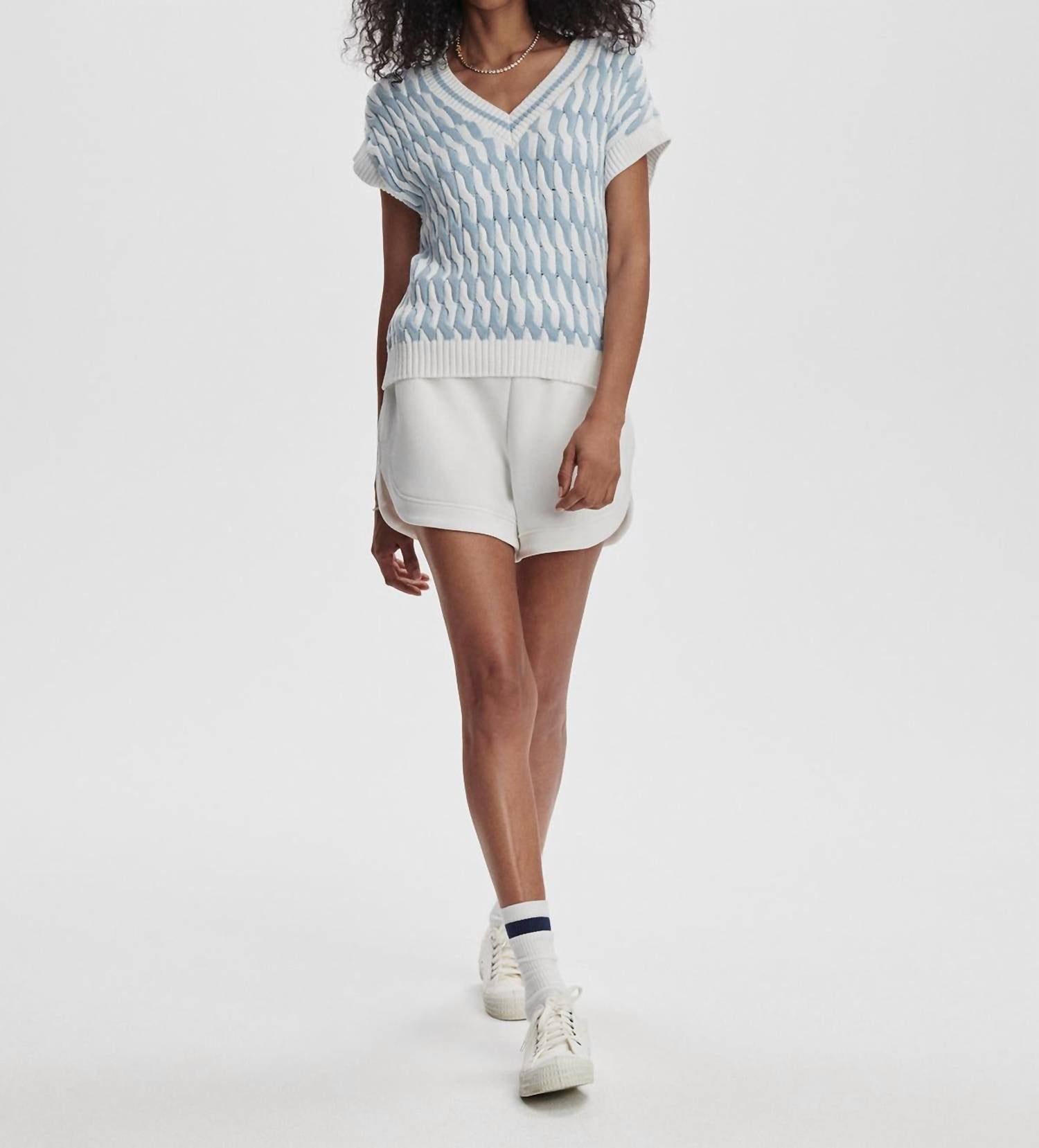 Enhance your wardrobe with the Alfie Cable Knit Vest by Varley, offering a unique blend of texture and color. This sleeveless vest, crafted from 100% cotton, showcases a bold white and celestial blue two-tone design. With a relaxed fit and a V-neckline, it serves as a versatile layering piece. Closure: Pull-on style. Care: Machine wash and line dry.