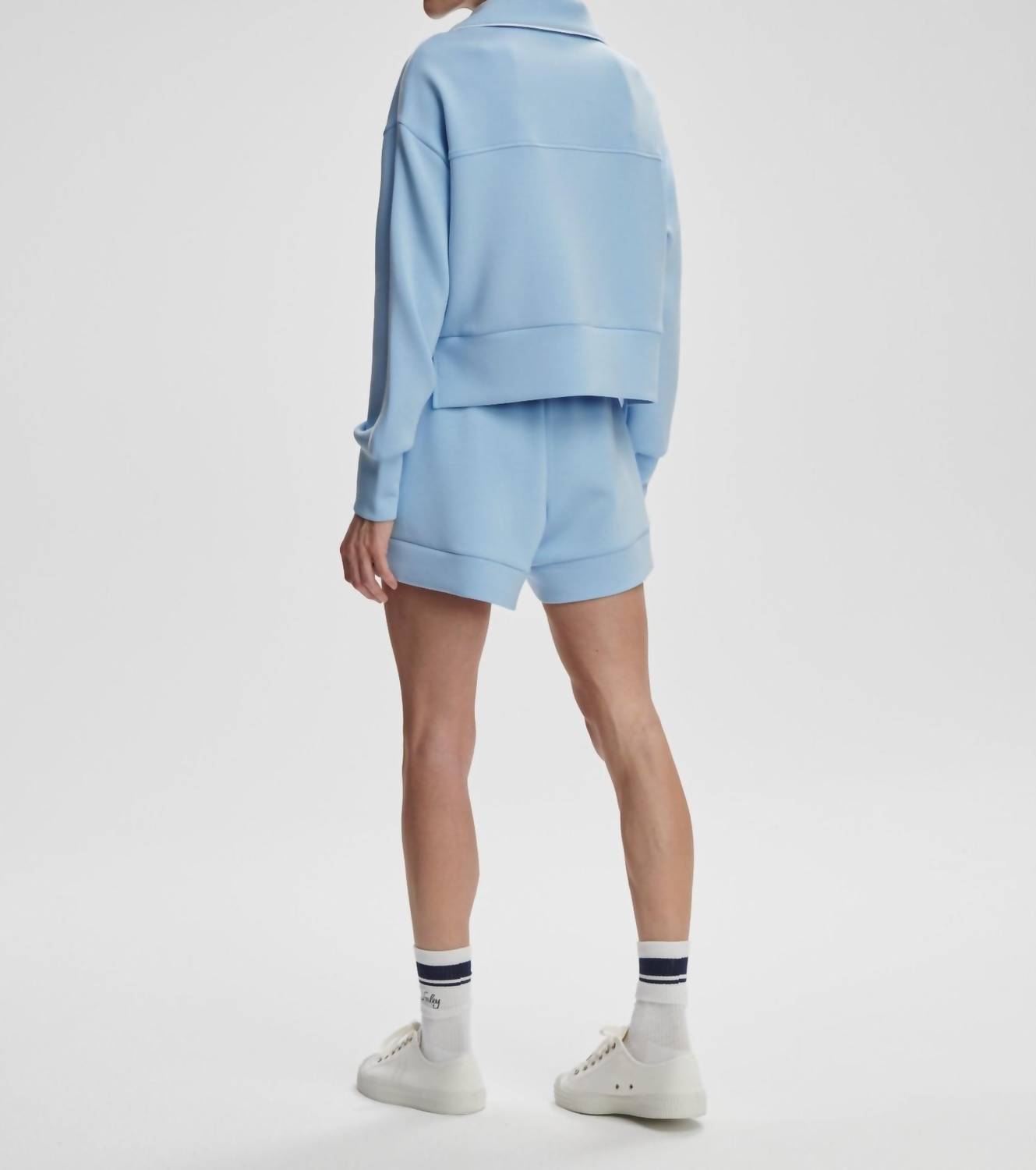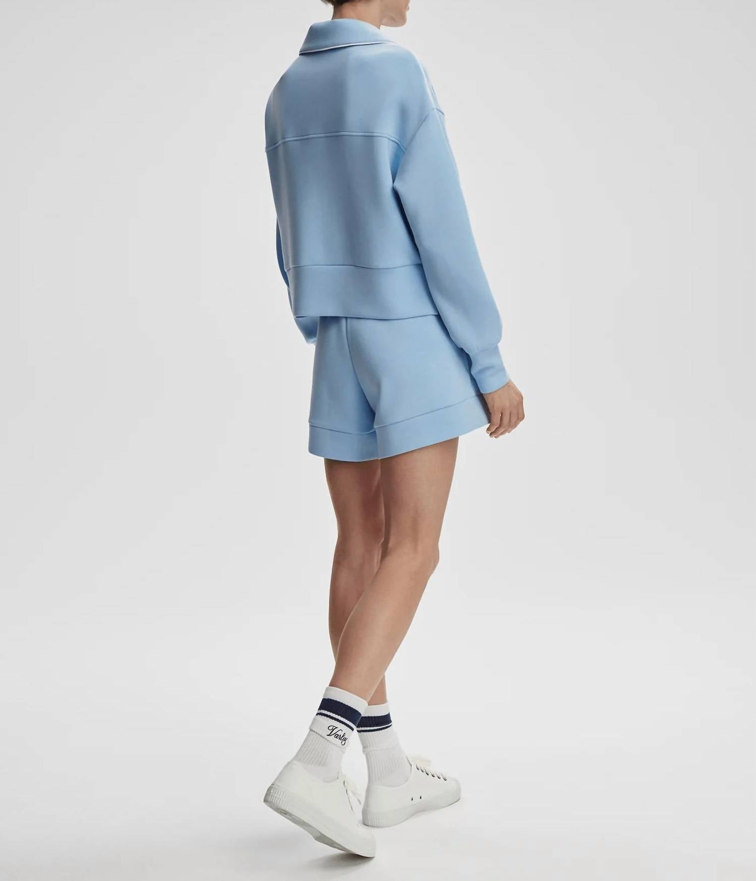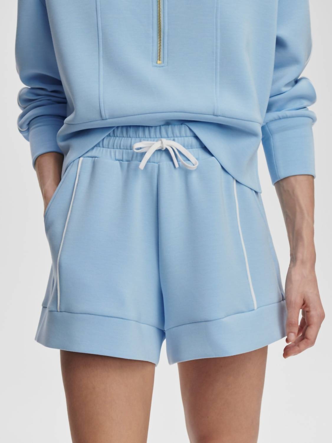 The Women's Barnes High Rise Short by VARLEY is designed for supreme comfort and style in a vibrant Airy Blue. Made from a blend of 81% Viscose, 15% Polyester, and 4% Elastane, these minimalist high-rise shorts offer a cool feel with added piping texture. They feature practical pockets and a secure tie closure. Care for these vacation-ready shorts is easy with machine wash instructions; lay flat to dry.