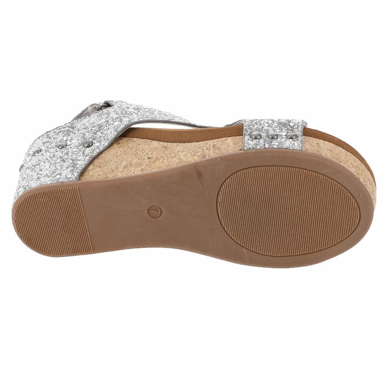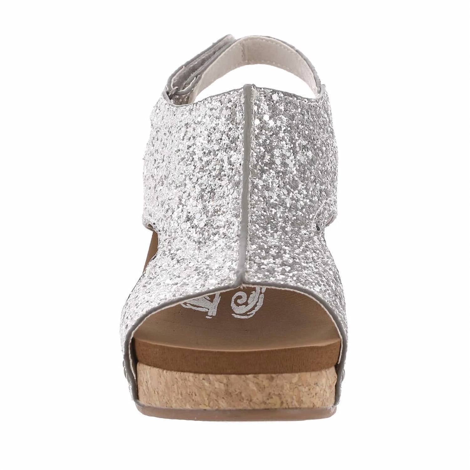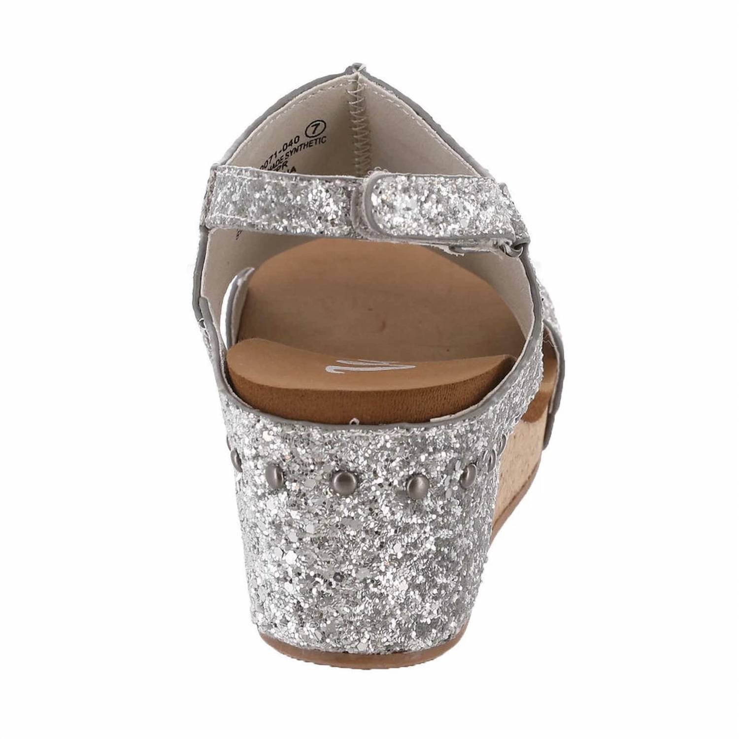 Timeless wedges that will be relevant season after season. Step into style with the Women's Culver Wedge Sandals by Very G, featuring an eye-catching glitter-detailed synthetic upper. Embrace comfort and ease with a lightly cushioned footbed and secure hook-and-loop closure. These sandals showcase a chic 2.5" wedge heel, providing a sophisticated lift. Perfect for any occasion, these open toe sandals add a touch of sparkle to your wardrobe.