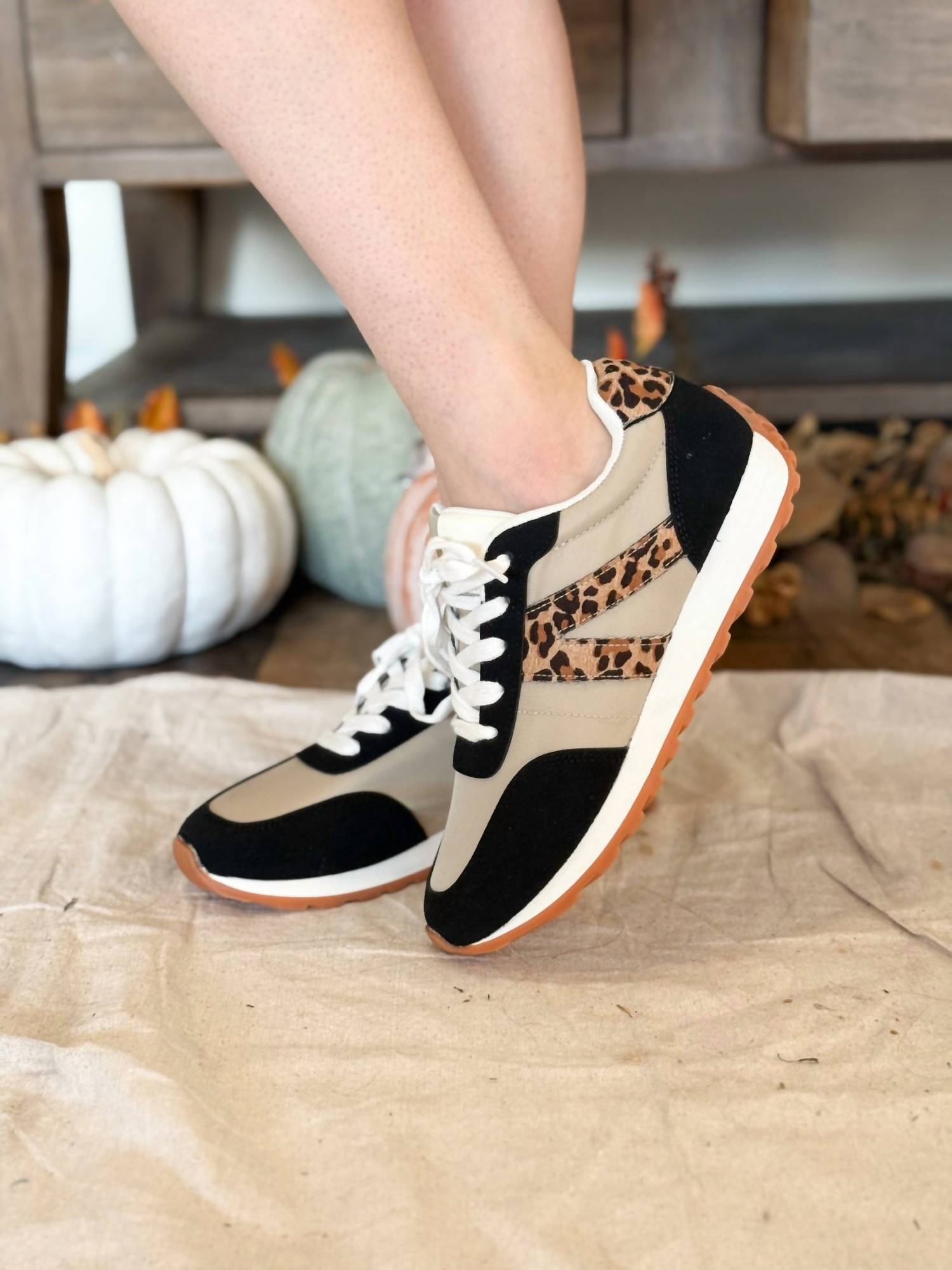 Cute, functional, and comfortable. These sneakers check all the boxes. Elevate your streetwear with the Women's Leopard Days Sneakers by Very G, featuring a vibrant mix of tan, black, white, and leopard print accents. These lace-up sneakers boast a cushioned footbed for all-day comfort and a durable gum outsole for reliable traction. Designed for effortless style, they perfectly complement jeans, joggers, or casual dresses, making them ideal for vacation wear or spring outings. Proudly embracing a flat heel and round toe silhouette, they are true to size and crafted with a flair for chic versatility.